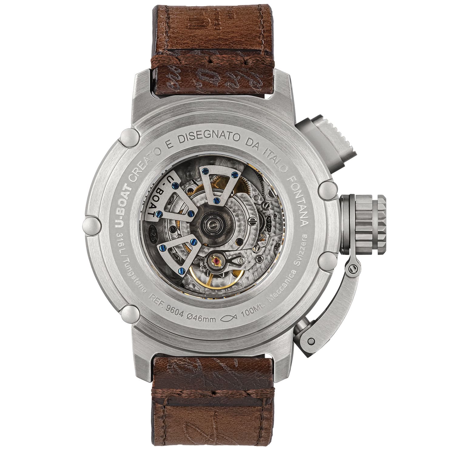 Zegarek U-BOAT został wykonany z odpornej na korozję stali AISI 316L. Solidne zamknięcie pomiędzy polerowanym pierścieniem z wolframu a deklem zostało zrealizowane dzięki zastosowaniu zewnętrznych zaczepów, które łączą się z deklem. Duża, zakręcana osłona koronki zapewnia klasę szczelności do 100 metrów. Konstrukcja zegarka obejmuje pięć śrub mocujących pierścień, a przyciemniane szkło pozwala na podgląd pracy mechanizmu. Wysokiej jakości kryształ szafirowy z powłoką antyrefleksyjną gwarantuje doskonałą czytelność tarczy. Pasek w kolorze brązowym, wykonany z postarzanej skóry, został ręcznie uszyty w Toskanii przez doświadczonych rzemieślników, którzy z troską wybierają materiały i stosują tradycyjne, włoskie metody obróbki.
