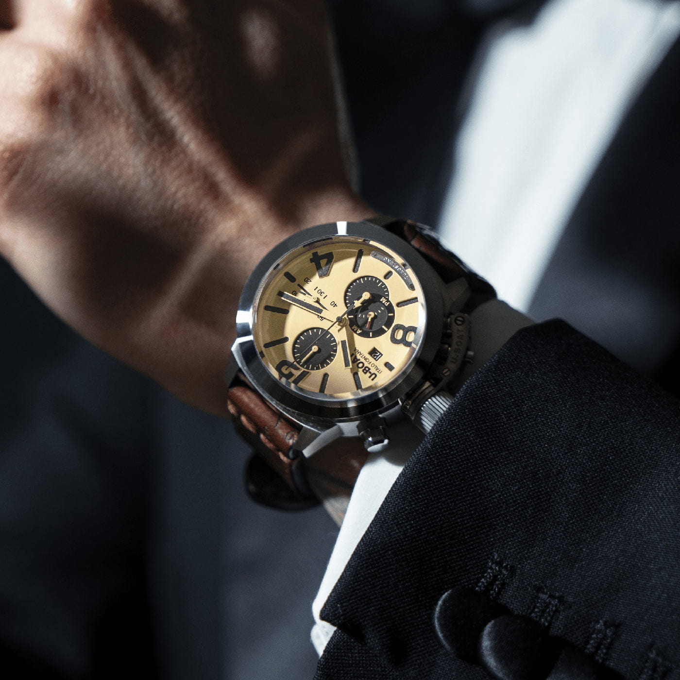 Koperta wykonana jest ze stali szlachetnej klasy 316L, co gwarantuje doskonałą odporność na zarysowania i korozję. Jej powierzchnia nie uczula, dlatego mogą ją nosić nawet osoby z wrażliwą skórą. Wykwintna ramka z polerowanego wolframu dodaje nie tylko estetycznego wyglądu, ale także odporności na działanie czasu. Specjalnie opracowana dźwignia ekstrakcji korony z lewej strony umieszczona jest o godzinie 8:30. Średnica tego vintage'owego czasomierza marki U-BOAT wynosi aż 45 mm, co zadowoli mężczyzn ceniących sobie oryginalne zegarki z dużą kopertą.