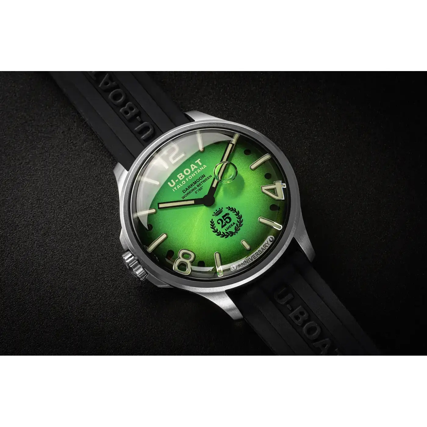U-BOAT Darkmoon 25° Anniversary SS Green Soleil to zegarek z olejem o imponującej średnicy 46,5 mm, stworzony dla koneserów poszukujących wyjątkowego stylu i technologicznej finezji. Pasek z ultrawytrzymałej wulkanizowanej gumy, ozdobiony wypukłym logo marki, dopełnia całości, oferując niezrównany komfort noszenia i wysoką postrzeganą wartość.