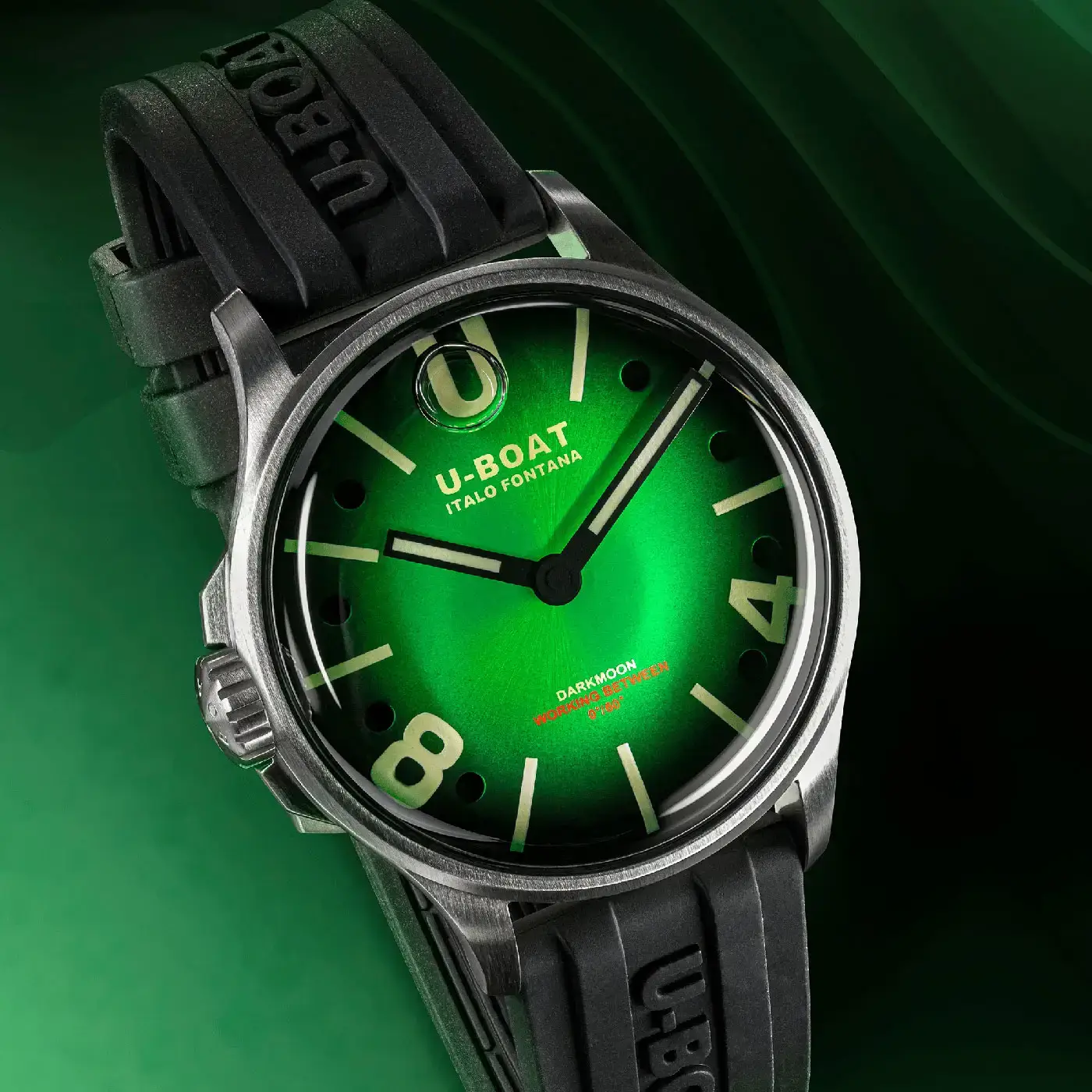 Zegarek męski z zieloną tarczą zanurzoną w oleju U-BOAT Darkmoon 40 mm Green SS Soleil 9502/B to doskonały przykład połączenia włoskiego rzemiosła z innowacyjnym podejściem do formy i koloru. Hipnotyzująca zielona tarcza z efektem soleil (płynnie przechodząca w głęboką czerń), otoczona satynowaną kopertą ze stali szlachetnej AISI 316L, przyciąga wzrok i nadaje całości niepowtarzalny charakter. Wypełnienie specjalnym olejem tworzy efekt „full immersion”, który optycznie eliminuje szkło i potęguje głębię koloru, a subtelny pęcherzyk powietrza na powierzchni tarczy nie tylko podkreśla awangardowy charakter włoskiego zegarka z linii Darkmoon 40 mm, ale i pełni funkcję kompensacyjną przy zmianach temperatury.