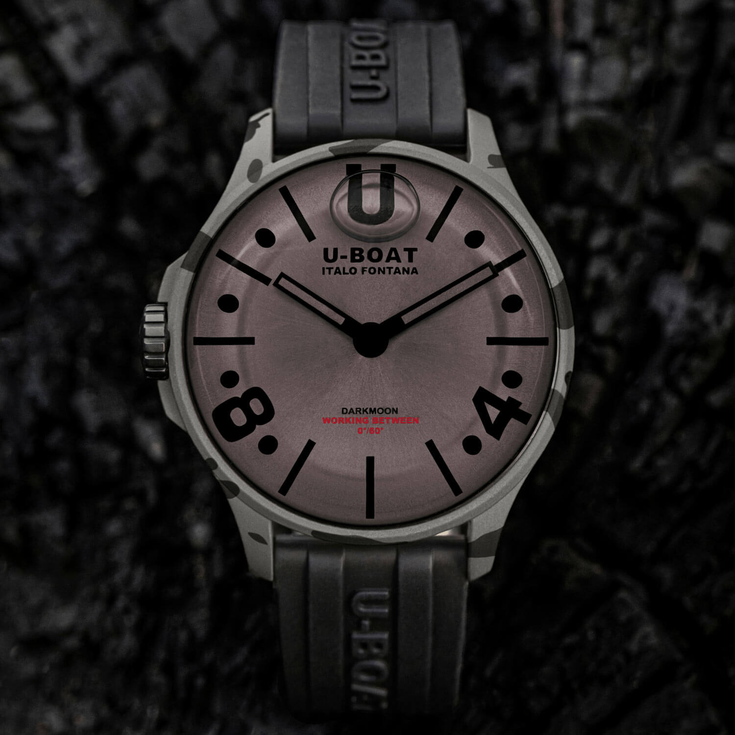 Męski zegarek z kopertą moro marki U-BOAT Italo Fontana wyposażony został w szwajcarski mechanizm kwarcowy Ronda 712.3, smarowany w kąpieli olejowej, co gwarantuje precyzję i niezawodność. Specjalny olej wypełniający szary cyferblat tworzy iluzję braku szkła, intensyfikując kolor i poprawiając czytelność. Widoczny pęcherzyk powietrza na tarczy kompensuje wahania temperatury. Charakterystyczna lewa osłona zakręcanej koronki nadaje produktowi unikatowy wygląd. Metalowa tarcza z wykończeniem typu soleil posiada indeksy i cyfry pokryte powłoką Super-Luminova, zapewniając czytelność nawet w ciemności. Wskazówki wykonane z malowanego metalu posiadają powłokę świetlną w kolorze szarym, nadając zegarkowi vintage wyjątkowy charakter. Całość zabezpiecza ekskluzywne sferyczne szkło szafirowe, odporne na zarysowania.
