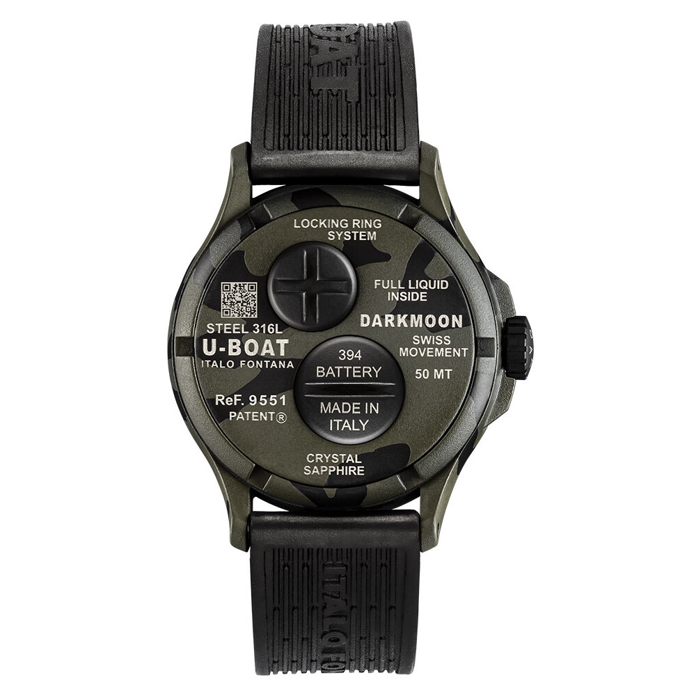 Model U-BOAT 9551 jest wodoszczelny do 50 metrów, chroniąc przed drobnym kontaktem z wodą. Funkcje obejmują wskazywanie godzin i minut. Innowacyjny system blokowania (Locking Ring System) umożliwia szybką wymianę baterii. Wygrawerowany laserowo kod QR oferuje ekskluzywne wrażenia cyfrowe i łatwy dostęp do instrukcji przez skanowanie smartfonem. Wyjątkowo wytrzymały pasek z wulkanizowanej gumy w kolorze czarnym wyróżnia spersonalizowane wypukłe logo manufaktury. To idealna propozycja dla mężczyzn ceniących wyjątkowy styl i doskonałą jakość wykonania. Darkmoon Camouflage 40 MM to nie tylko zegarek, lecz również wyraz indywidualności i elegancji. Podkreśl swój unikalny styl z Darkmoon Camouflage, gdzie klasyka spotyka nowoczesność w doskonałym połączeniu formy i funkcji.