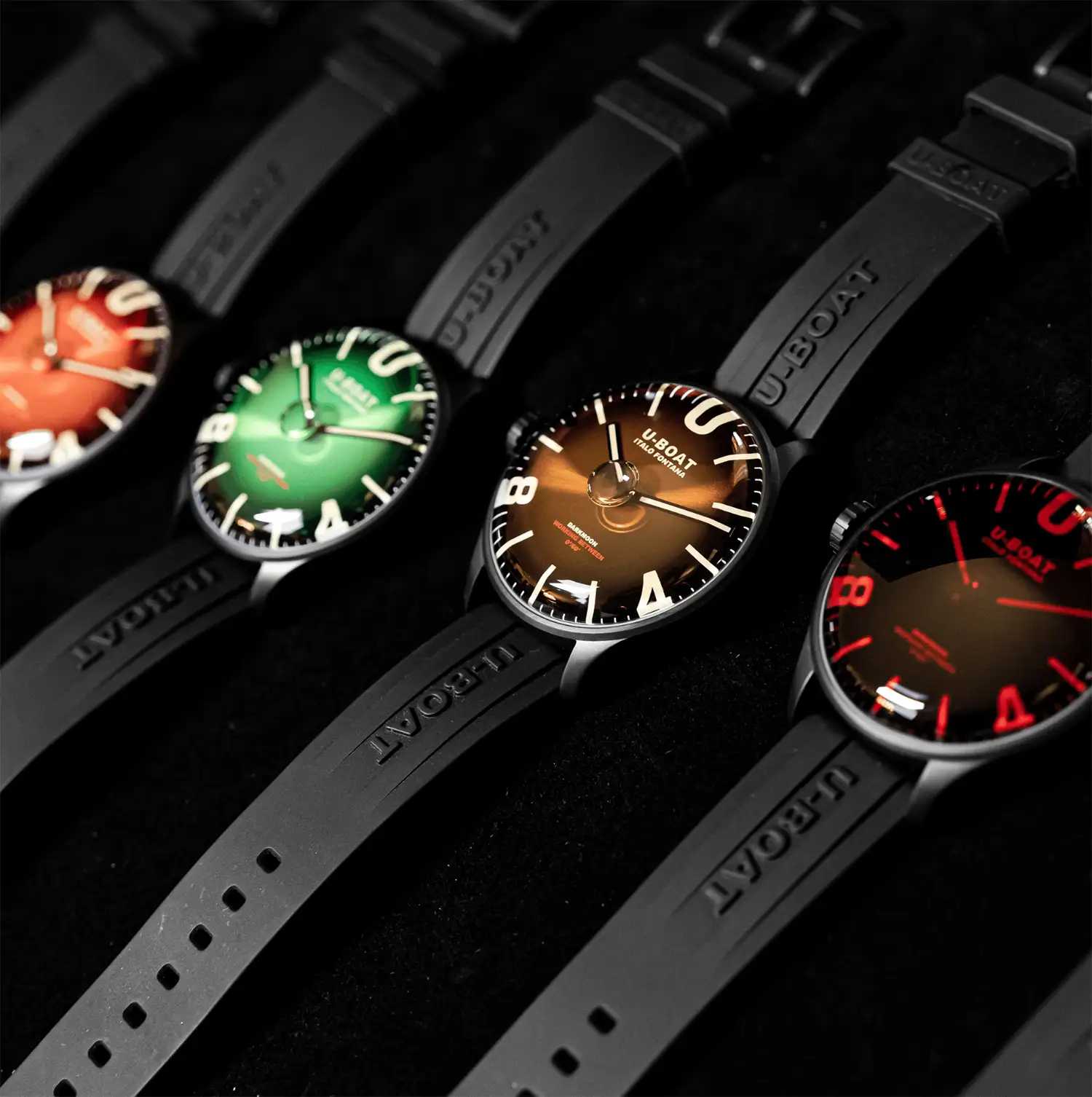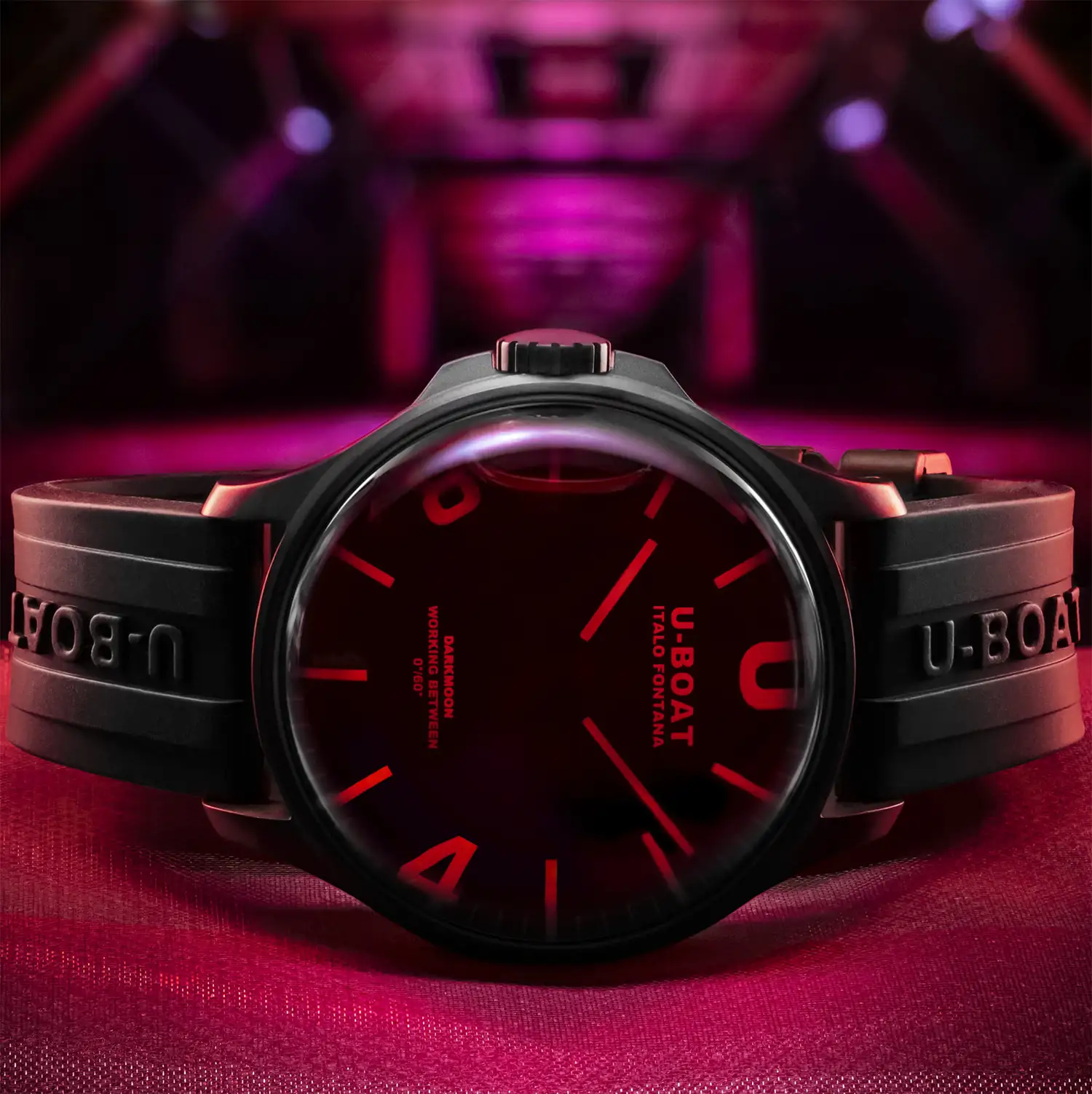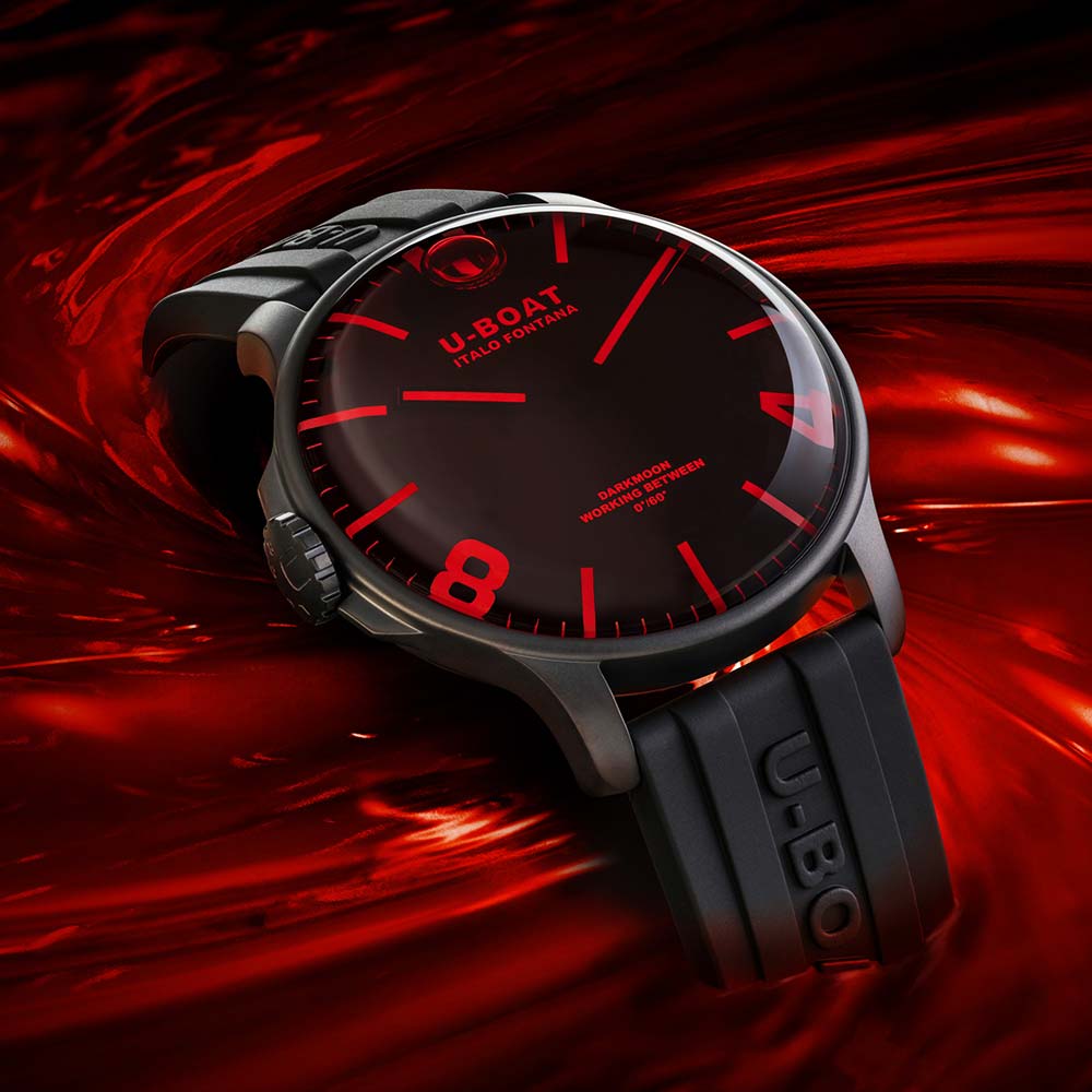 Kolekcja U-Boat Darkmoon, jak zdradza twórca, wyłoniła się wprost z Księżyca, a dokładnie z jego, ciemniejszej strony. Podążając za pomysłem odkrytym po raz pierwszy przy pomocy modelu Capsoil, Darkmoon jeszcze bardziej zagłębia się w innowacyjną koncepcję „oleju immersyjnego”. Wnętrze zegarka ze szwajcarskim mechanizmem kwarcowym Ronda jest teraz zanurzony w kąpieli olejowej. Oleista ciecz całkowicie otacza tarczę, tworząc iluzję nieistniejącego szkła, intensyfikując do maksimum odcień czerni, a także czyniąc tarczę czytelną, jak w żadnym zegarku. Co więcej, pod zakrzywionym, czerwonym szkłem szafirowy bezustannie i swobodnie, w rytm ruchu nadgarstka, przemieszcza się kompensacyjny pęcherzyk powietrza. Dodatkowo podsyca atrakcyjny wizerunek czasomierza i dowodzi ambitnego, kreatywnego oraz niezależnego podejścia Italo Fontany do kwestii projektowania.