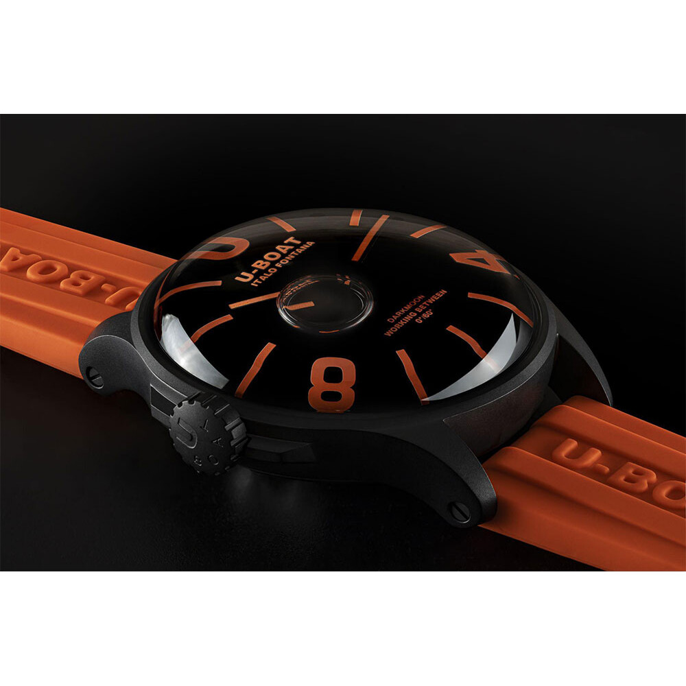 Na charakterystyczną i bardzo wyraźną podziałkę czasu składa się kilka indeksów liniowych, 2 cyfry arabskie oraz natychmiastowo zauważalna, duża litera "U", od U-Boat, na godzinie 12. Po zmroku za oświetlenie oryginalnej skali czasu posłuży Super-LumiNova®. Wokół tarczy rozciąga się perfekcyjnie wykończona, czarna koperta z powłoką PVD ze stali nierdzewnej 316L z kultową dla marki koronką po lewej stronie. Lewostronne umiejscowienie elementu identyfikuje producenta, ale przede wszystkim ma za zadanie zagwarantować większą swobodę nadgarstka w trakcie posługiwania się czasomierzem. Wytrzymałą i wysoce odporną na zarysowania, szczotkowaną kopertą zawieszono na pomarańczowym pasku z wulkanizowanej gumy, dużo bardziej odpornej na stres i uszkodzenia niż kauczuk niewulkanizowany. Pasek zdobi i naznacza, niedające się nie dostrzec, rozpoznawalne logo U-Boat.