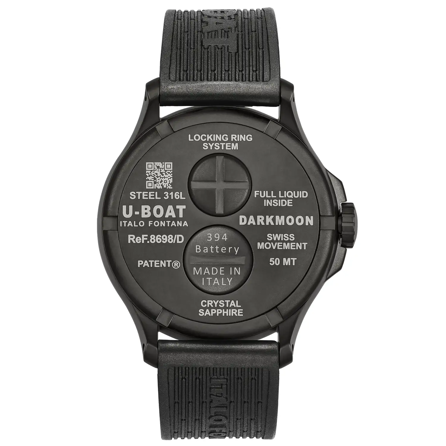 Pasek zegarka U-BOAT Darkmoon 44 mm wykonany jest z czarnej, ultra odpornej gumy wulkanizowanej, która zapewnia komfort noszenia i trwałość. Warto dodać, że pasek posiada tłoczone logo marki oraz stalową klamrę. Zegarek wyposażony jest w precyzyjny szwajcarski mechanizm kwarcowy Ronda 712.3, smarowany specjalnym olejem, co zapewnia niezawodność i dokładność działania.