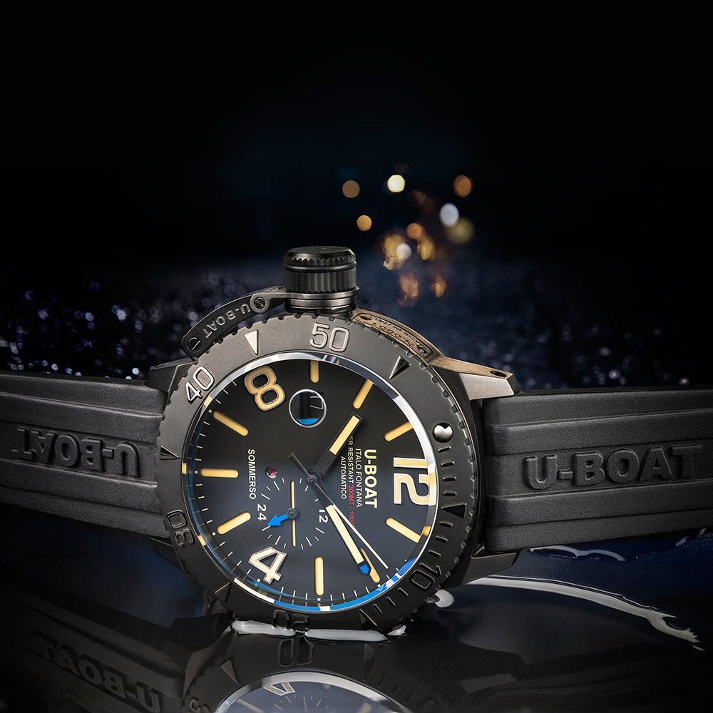 U-BOAT ITALO FONTANA Sommerso DLC 9015 z ikoniczną, masywną i niezwykle poręczną obudową zakręcanej koronki po lewej stronie, wysoką klasą wodoszczelności do 30 bar, 300 metrów, pozwalającą na zawodowe nurkowanie, oraz ze szwajcarskim mechanizmem automatycznym stanowi idealną ofertę dla Panów o podwodnej pasji, sympatii do wodnych konwencji oraz dla tych, którzy pragną się wyodrębnić w niebanalny sposób. SOMMERSO DLC doda swemu użytkownikowi niewysłowionej i nieco tajemniczej charyzmy, za którą stoją cenione, włoska jakość i gust.