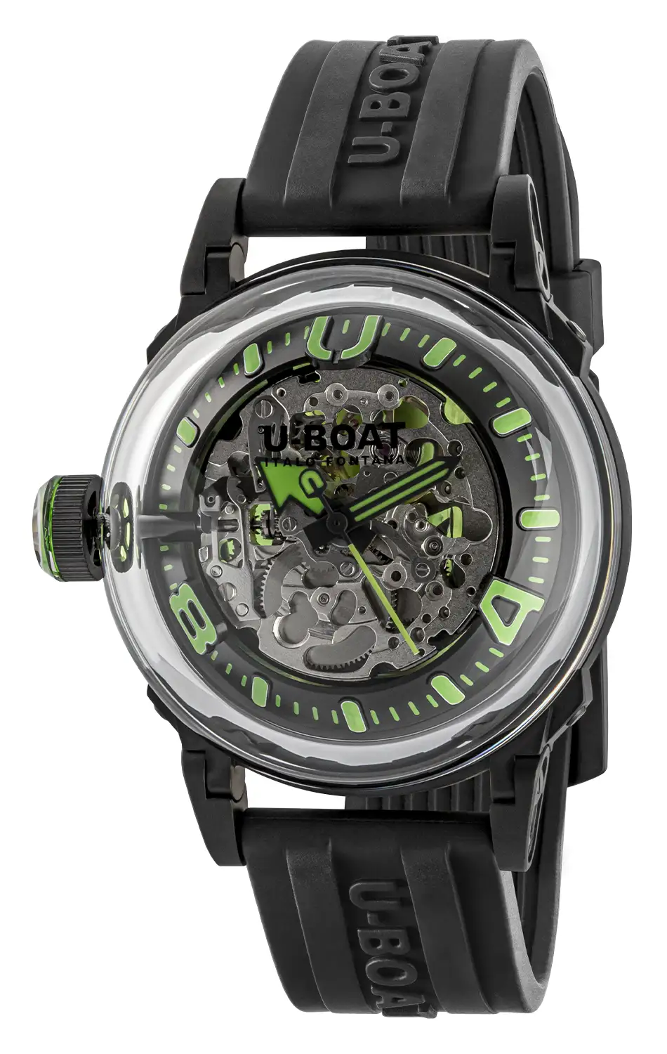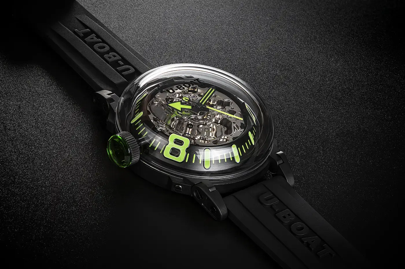 Nowa generacja U-BOAT U-65 Automatic zaprasza do kontemplacji ruchu w każdej jego odsłonie: obrotu specjalnie zaprojektowanego wahnika, widocznego przez zielone szkło dekla, oraz pracy szkieletowanego mechanizmu, wyeksponowanego na industrialnej tarczy pod ultrawypukłym szkłem mineralnym K9.