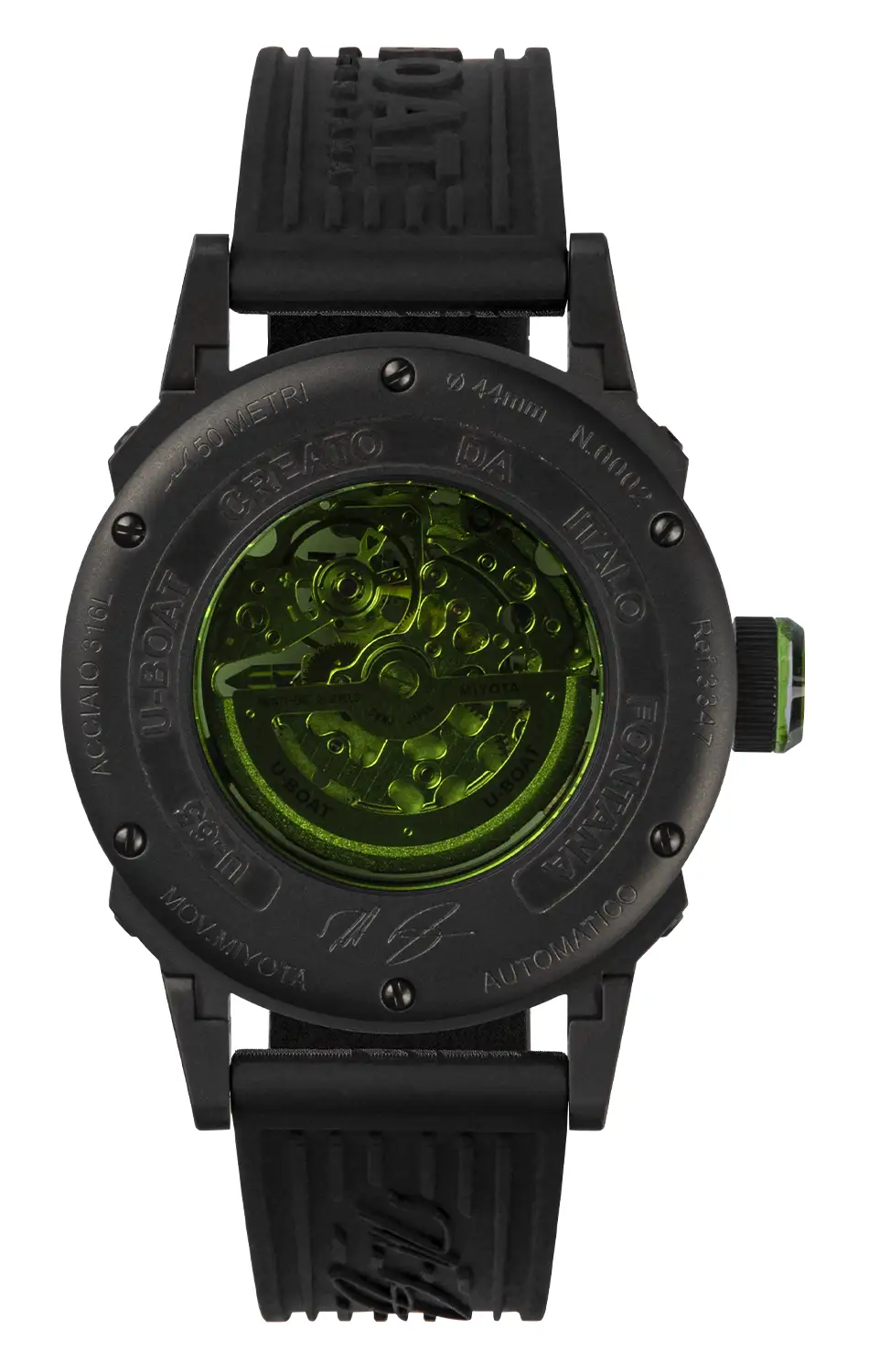 We wariancie U-BOAT 3347 model zachwyca industrialnym wykończeniem i zdecydowaną stylistyką, a opatentowane ruchome uszy gwarantują idealne dopasowanie do nadgarstka mimo 44-milimetrowej koperty ze stali szlachetnej pokrytej czarną powłoką PVD. Zielona szklana wstawka w koronce harmonizuje z odcieniem luminescencji i zielonym deklem ekspozycyjnym, przez który można obserwować personalizowany wahnik podczas pracy mechanizmu. Kontrast czerni PVD z zielonymi akcentami buduje spójną, dynamiczną kompozycję, w której światło i ruch układają się w opowieść o czasie zaklętym w pulsującym kalibrze. Wodoszczelność do około 50 metrów oraz silikonowy pasek z charakterystycznym tłoczeniem zapewniają wysoki komfort i podkreślają charakterystyczną, surową elegancję U-BOAT.