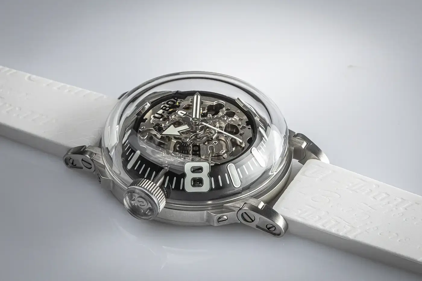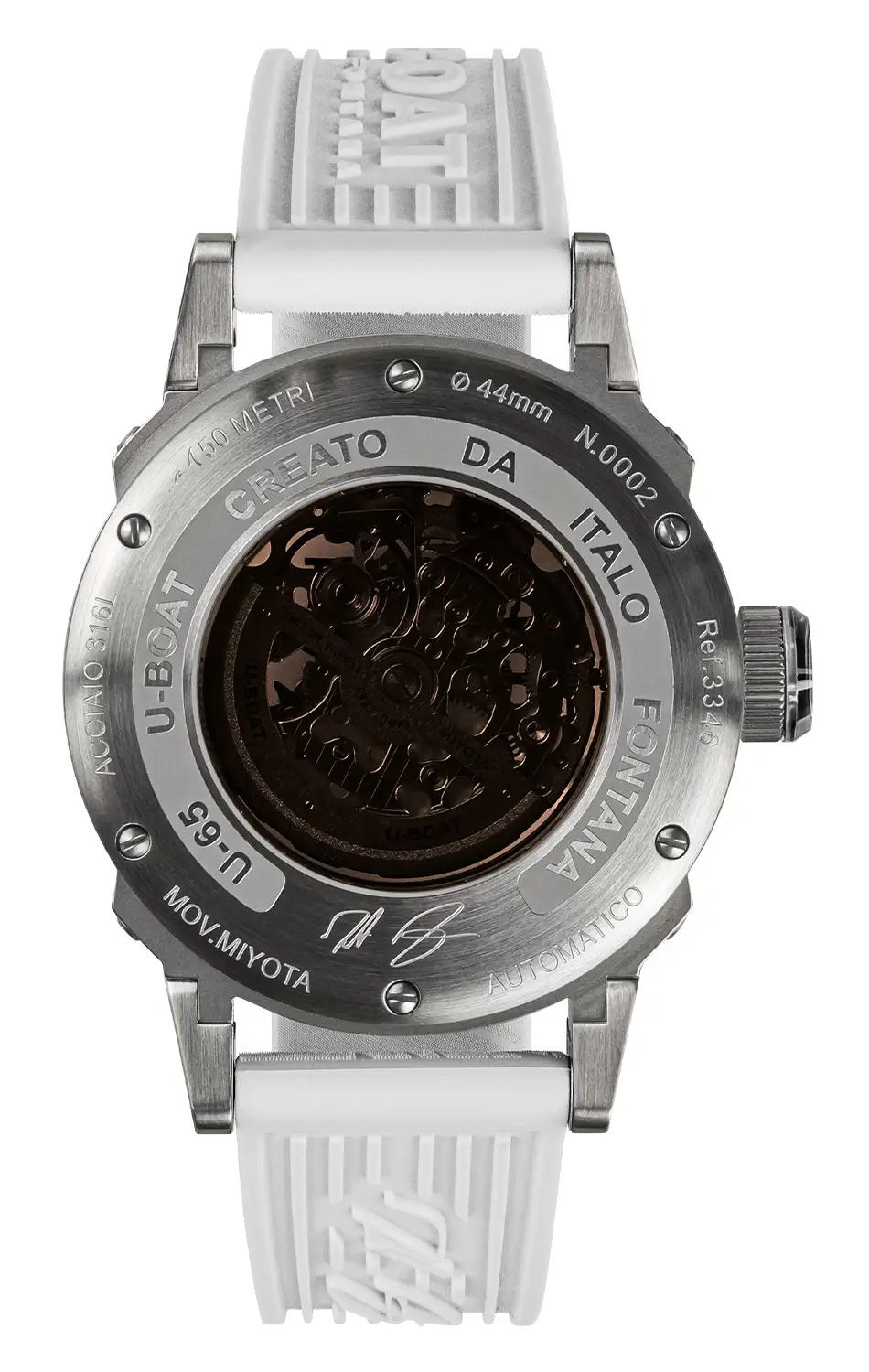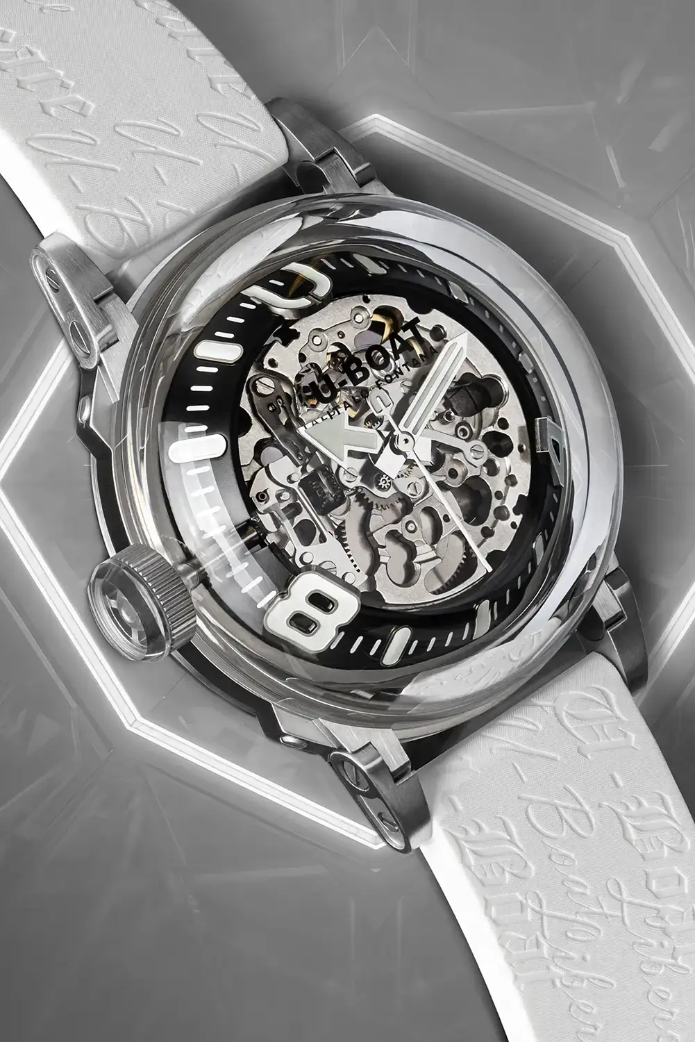 W wariancie białym U-BOAT 3346 model imponuje precyzyjną obróbką i industrialnym wykończeniem, a charakterystyczne ruchome uszy – opatentowane przez markę – gwarantują idealne dopasowanie do nadgarstka mimo efektownej koperty o średnicy 44 mm. Szklana wstawka w koronce harmonizuje z odcieniem luminescencji oraz przydymionym deklem ekspozycyjnym, przez który można obserwować personalizowany rotor podczas pracy mechanizmu. W efekcie powstaje spójna kompozycja, w której kolor, światło i ruch tworzą jedną narrację o czasie zaklętym w pulsującym kalibrze. Wodoszczelność do około 50 metrów oraz silikonowy pasek w białym odcieniu z charakterystycznym tłoczeniem zapewniają wygodę codziennego noszenia i podkreślają rozpoznawalny styl U-BOAT.