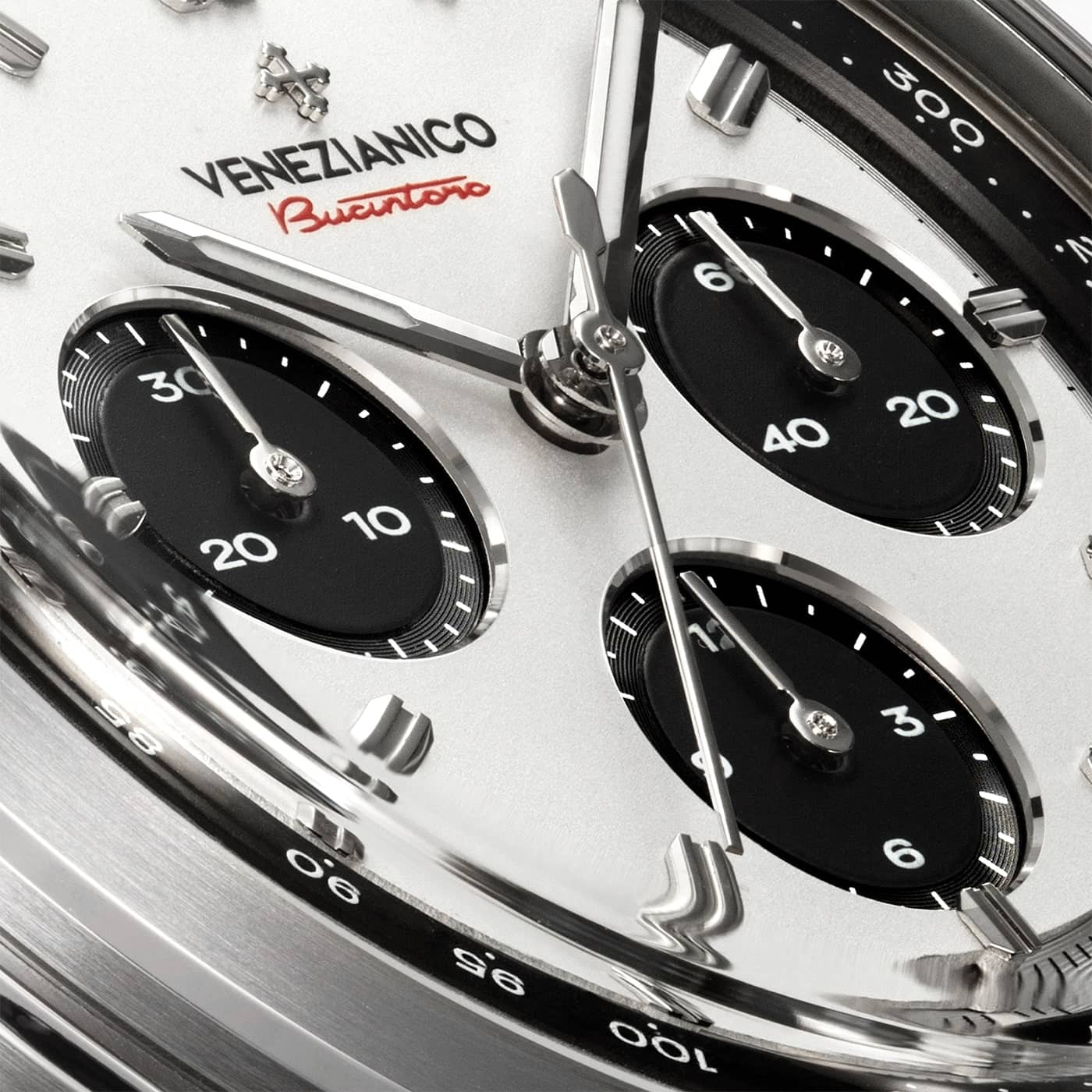 Venezianico Bucintoro Tricompax wyróżnia się smukłą kopertą o grubości zaledwie 11,70 mm, co w połączeniu z wypukłym, szafirowym szkłem o grubości 1,90 mm, odpornym na zarysowania, zapewnia doskonałe dopasowanie do różnych nadgarstków. Przejrzystość tego szkła w połączeniu z podświetleniem BGW9 Super-LumiNova® na indeksach i wskazówkach stanowi idealne rozwiązanie w zegarku. Ten zaawansowany pigment luminescencyjny, biały w świetle dziennym, po naładowaniu emituje intensywną niebiesko-zieloną poświatę, zapewniając dobrą widoczność w ciemności. Mimo swojej imponującej specyfikacji technicznej, Bucintoro zachowuje wszechstronny i elegancki design. Koperta wykonana z trwałej stali nierdzewnej 316L oraz podwójnie wykończona bransoleta Canova, czynią ten automatyczny chronograf doskonałym wyborem na każdą okazję – zarówno na co dzień, jak i podczas formalnych wydarzeń.