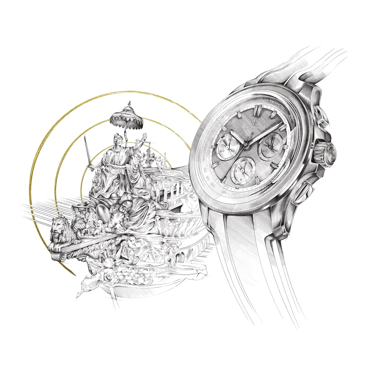 Męski zegarek Venezianico Bucintoro Tricompax 42 8221510C to elegancki chronograf z trzema licznikami i tachymetrem, inspirowany historycznym Bucintoro — galerą doży Republiki Weneckiej Serenissima (Doge's Galley), używaną podczas ceremonii, takich jak otwarcie Historycznych Regat, prestiżowej imprezy sportowej z udziałem najlepszych wioślarzy Wenecji, dziś znanych jako "Regata Storica" (Regaty Historyczne). Wyścig ten doskonale łączy w sobie ducha rywalizacji na wodzie z elegancją weneckiej tradycji.