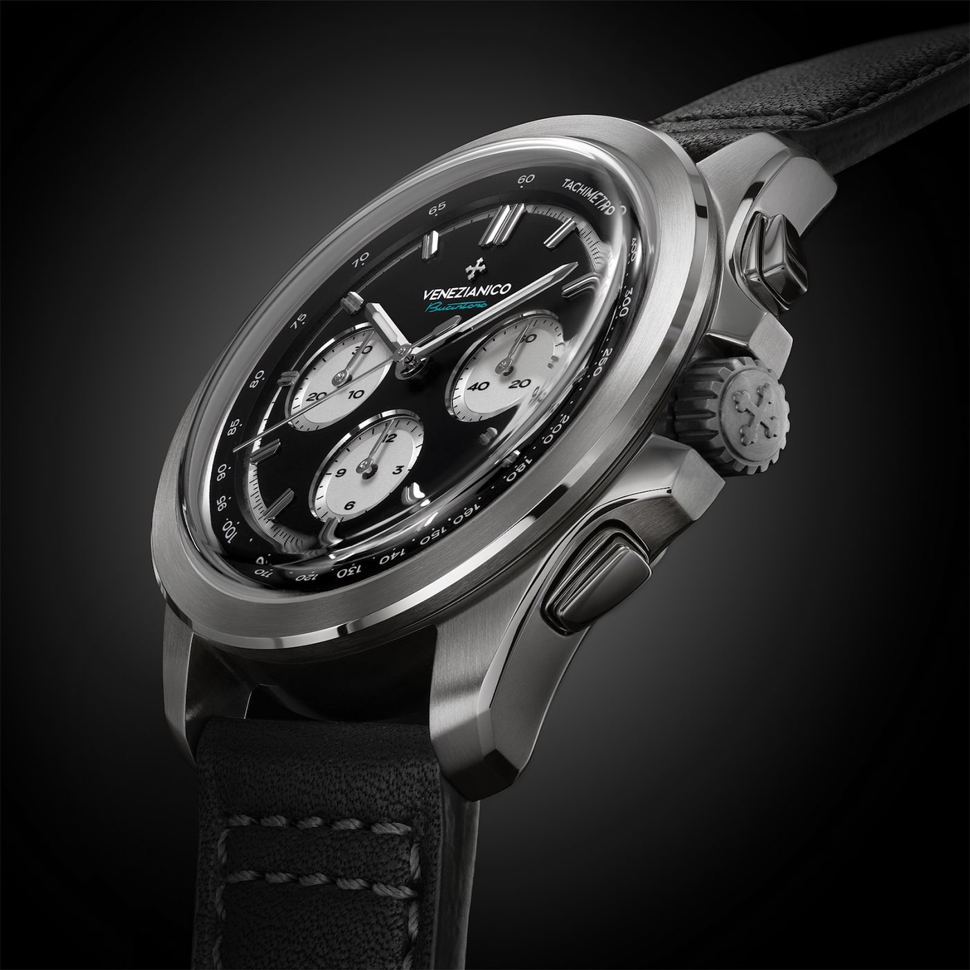 Venezianico Bucintoro Tricompax wyróżnia się smukłą kopertą o grubości zaledwie 11,70 mm, co w połączeniu z wypukłym, szafirowym szkłem o grubości 1,90 mm, odpornym na zarysowania, zapewnia doskonałe dopasowanie do różnych nadgarstków. Przejrzystość tego szkła w połączeniu z podświetleniem BGW9 Super-LumiNova® na indeksach i wskazówkach stanowi idealne rozwiązanie w zegarku. Ten zaawansowany pigment luminescencyjny, biały w świetle dziennym, po naładowaniu emituje intensywną niebiesko-zieloną poświatę, zapewniając dobrą widoczność w ciemności. Mimo swojej imponującej specyfikacji technicznej, Bucintoro zachowuje wszechstronny i elegancki design. Koperta wykonana z trwałej stali nierdzewnej 316L oraz komfortowy, czarny skórzany pasek, czynią ten automatyczny chronograf doskonałym wyborem na każdą okazję – zarówno na co dzień, jak i podczas formalnych wydarzeń.