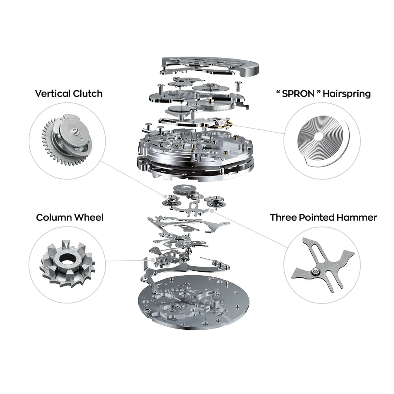 Mechanizm ten wyróżnia się zastosowaniem koła kolumnowego i sprzęgła pionowego, które gwarantują najwyższą precyzję działania. Dzięki tym rozwiązaniom eliminuje się problem "skaczącej wskazówki", często spotykany w systemach bez takich elementów. Koło kolumnowe, przypominające kształtem wieniec średniowiecznej wieży, odgrywa kluczową rolę w płynności pracy mechanizmu. Każdy ząb tego koła, zwany "kolumną", jest ręcznie wykańczany, co pozwala usunąć nawet najmniejsze niedoskonałości po procesie produkcyjnym, zapewniając jeszcze bardziej komfortowe użytkowanie zegarka.