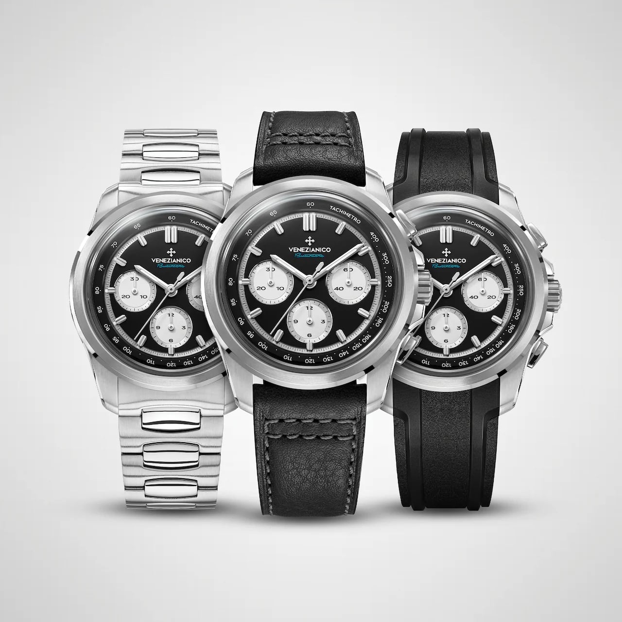 Venezianico Bucintoro Tricompax wyróżnia się smukłą kopertą o grubości zaledwie 11,70 mm, co w połączeniu z wypukłym, szafirowym szkłem o grubości 1,90 mm, odpornym na zarysowania, zapewnia doskonałe dopasowanie do różnych nadgarstków. Przejrzystość tego szkła w połączeniu z podświetleniem BGW9 Super-LumiNova® na indeksach i wskazówkach stanowi idealne rozwiązanie w zegarku. Ten zaawansowany pigment luminescencyjny, biały w świetle dziennym, po naładowaniu emituje intensywną niebiesko-zieloną poświatę, zapewniając dobrą widoczność w ciemności. Mimo swojej imponującej specyfikacji technicznej, Bucintoro zachowuje wszechstronny i elegancki design. Koperta wykonana z trwałej stali nierdzewnej 316L oraz podwójnie wykończona bransoleta Canova, czynią ten automatyczny chronograf doskonałym wyborem na każdą okazję – zarówno na co dzień, jak i podczas formalnych wydarzeń.