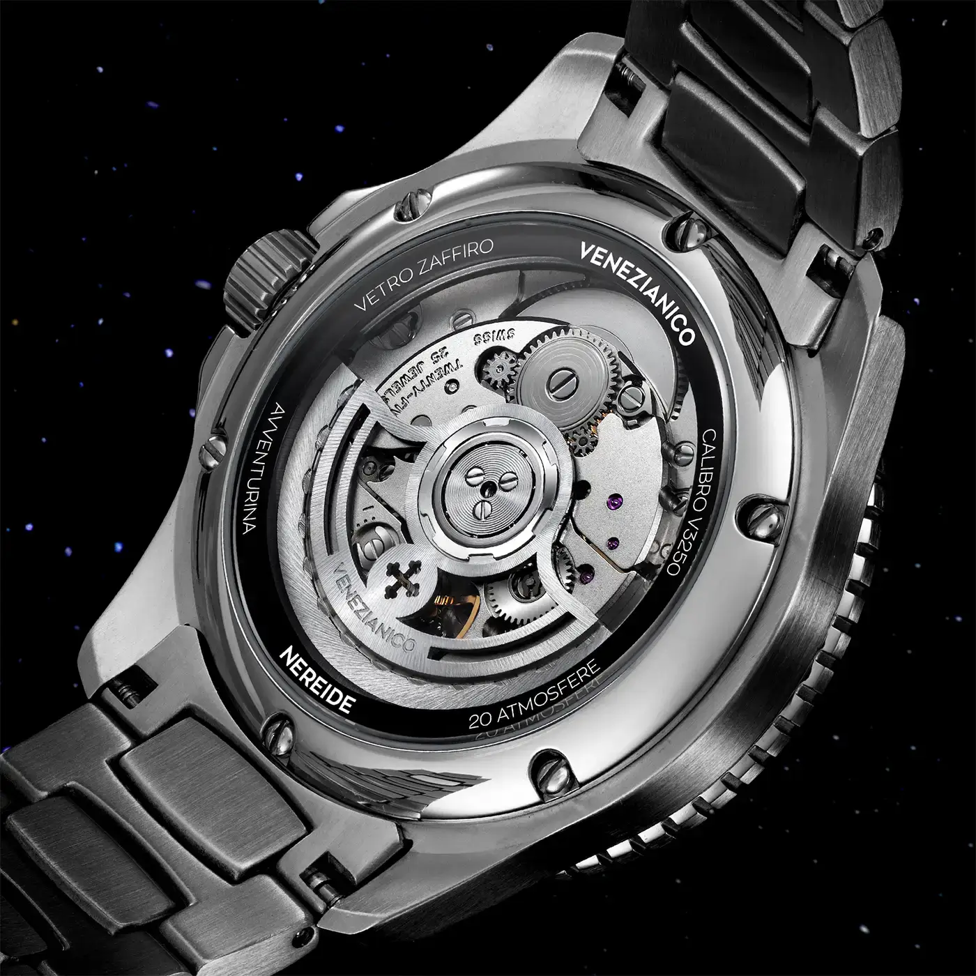 Sercem automatycznego zegarka męskiego Venezianico jest innowacyjny mechanizm V3250, opracowany w szwajcarskich zakładach Soprod SA. Opiera się on na bazie kalibru M100 i wyróżnia się niezwykle smukłą konstrukcją, dzięki czemu Nereide 39 zachowuje imponującą grubość zaledwie 10,4 mm. Szkieletowany rotor pokryty rodem podkreśla wyrafinowaną estetykę mechanizmu, a precyzyjna regulacja we włoskim laboratorium Venezianico gwarantuje dokładność -4/+6 sekund na dobę, spełniając standardy haute horlogerie. To rozwiązanie czyni Nereide Avventurina jednym z najbardziej niezawodnych i stylowych czasomierzy w swojej klasie. Dodatkowo, zegarek posiada odporną na zarysowania wkładkę bezela z wolframu, obracającą się w 120 precyzyjnych kliknięciach, oraz szkło szafirowe z powłoką antyrefleksyjną, zapewniające doskonałą czytelność w każdych warunkach.