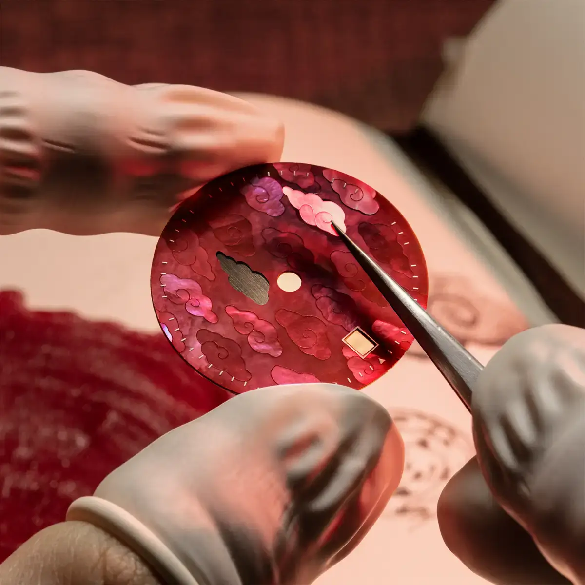Najbardziej wyrazistym elementem tej edycji jest ręcznie składana tarcza z czerwonej masy perłowej, tworzona poprzez precyzyjne układanie drobnych fragmentów w mozaikowy wzór inspirowany tradycyjnym motywem chmur. W chińskiej symbolice chmury oznaczają pomyślność, dobrobyt i harmonię, a ich uporządkowany rytm na tarczy przywołuje estetykę cesarskich zdobień Xi’an. Naturalna iryzacja masy perłowej sprawia, że każda tarcza różni się subtelnie odcieniem i głębią koloru, co podkreśla unikatowy charakter każdego egzemplarza. Kompozycję dopełniają złote indeksy, czytelne wskazówki pokryte szwajcarską masą luminescencyjną BGW9 Super-LumiNova® (czysta biel w dzień i chłodna, niebieskawa poświata w nocy) oraz dwukolorowy pierścień GMT z cyframi w formie chińskich ideogramów ze szkła BK7, znanego z wyjątkowej klarowności optycznej i intensywnego nasycenia barw.