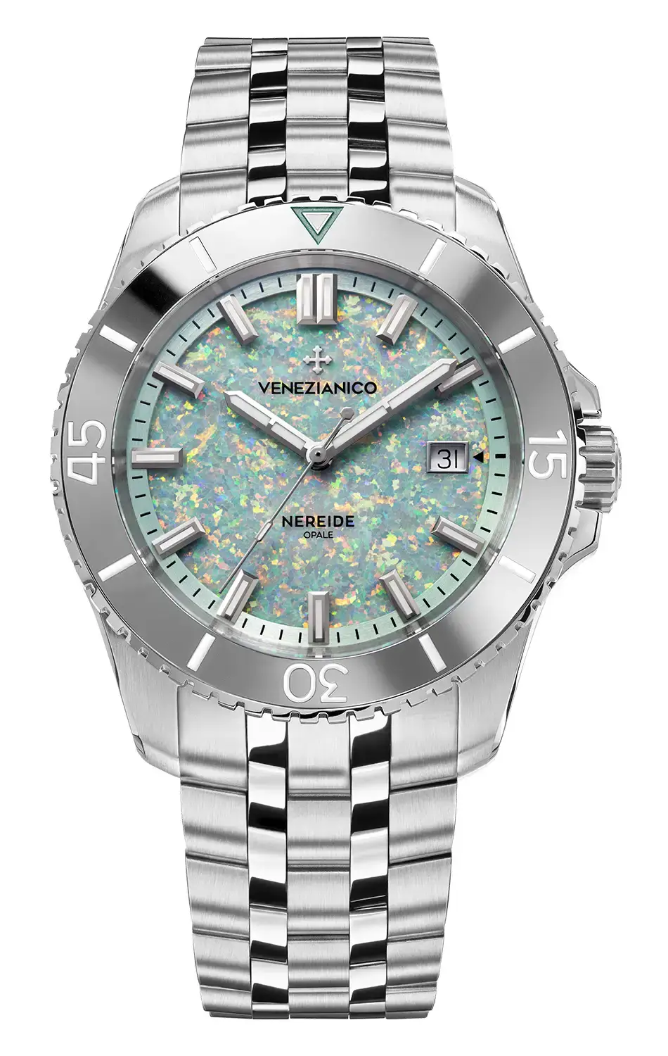 Limitowana edycja kolekcjonerska Venezianico Nereide Opale łączy szwajcarski mechanizm automatyczny widoczny przez przeszklony dekiel z ręcznie wykańczaną, opalową tarczą hodowaną laboratoryjnie. Stalowa koperta 316L, wolframowy bezel i wodoszczelność 200 m podkreślają nurkowy charakter, a autorska bransoleta Sansovino z mikroregulacją zapewnia komfort i elegancję.