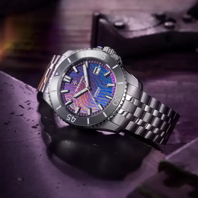 Limitowany zegarek nurkowy z tarczą z tytanu damasceńskiego Venezianico Nereide Ti-Damascus to dzieło dla koneserów ceniących zarówno wyrafinowaną estetykę, jak i funkcjonalność. Z wodoszczelnością do około 200 metrów oraz szafirowym szkłem z antyrefleksem jest przygotowany na każde wyzwanie, od eleganckich spotkań po aktywności na wodzie. Dopełnieniem całości jest ekskluzywne opakowanie inspirowane dynamicznymi kolorami tytanu damasceńskiego, stanowiące harmonijną kontynuację designu zegarka. To propozycja dla tych, którzy oczekują od automatycznego zegarka więcej niż precyzyjnego odmierzania czasu — dla tych, którzy szukają prawdziwej sztuki użytkowej.