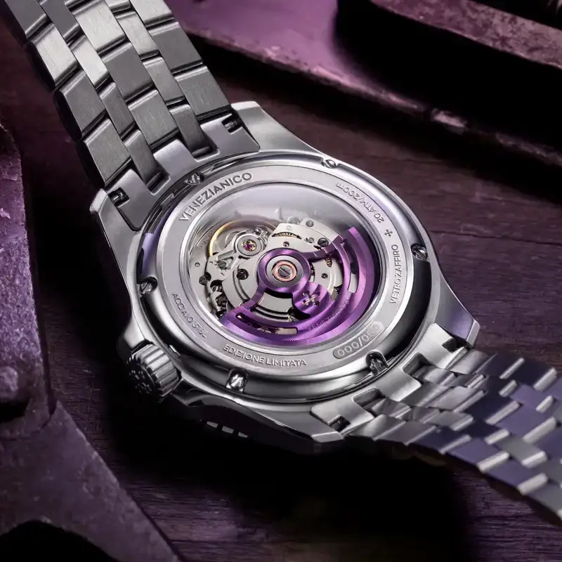 Za niezwykłą estetyką kryje się solidna inżynieria, która czyni Venezianico Ti-Damascus nie tylko ekskluzywnym modelem dla kolekcjonerów, ale również niezawodnym partnerem codziennych wyzwań. Koperta o średnicy 42 mm wykonana jest z odpornej stali nierdzewnej 316L, wzbogaconej o wytrzymały pierścień z polerowanego wolframu o imponującej twardości 9/10 w skali Mohsa. Sercem czasomierza jest szwajcarski mechanizm automatyczny Sellita SW200-1, którego płynny chód i około 38-godzinna rezerwa mocy zapewniają najwyższą precyzję. Szkieletowy wahnik z fioletową powłoką IP i dekoracją Côtes de Genève nawiązuje do barwnej tarczy, a przeszklony dekiel pozwala podziwiać mechaniczne piękno w ruchu.