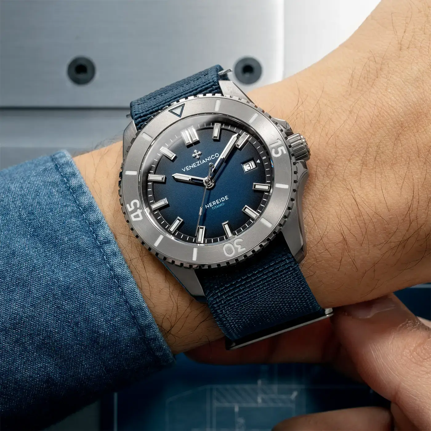 Tarcza zegarka Venezianico Titanio przyciąga wzrok subtelnymi detalami i precyzyjnym wykonaniem. Głębokie, matowe wykończenie tarczy o niebieskim gradiencie doskonale kontrastuje z wyrazistymi wskazówkami, indeksami i oznaczeniami na obrotowym pierścieniu, które w świetle dziennym są białe, a po naładowaniu emitują intensywny niebiesko-zielony blask w ciemności. Zostały one pokryte szwajcarską powłoką Super-LumiNova® BGW9, gwarantując doskonałą czytelność nawet w całkowitym braku światła. Zegarek napędza automatyczny mechanizm Seiko NH35A, znany z niezawodności i precyzji. Jest to werk o rezerwie chodu wynoszącej około 41 godzin, co gwarantuje płynne działanie i minimalną konieczność ręcznej ingerencji. Funkcjonalność podkreśla także wodoszczelność na poziomie około 30 ATM (300 metrów), dzięki czemu Venezianico Nereide Titanio doskonale sprawdza się zarówno podczas nurkowania, jak i w codziennych, bardziej formalnych sytuacjach.