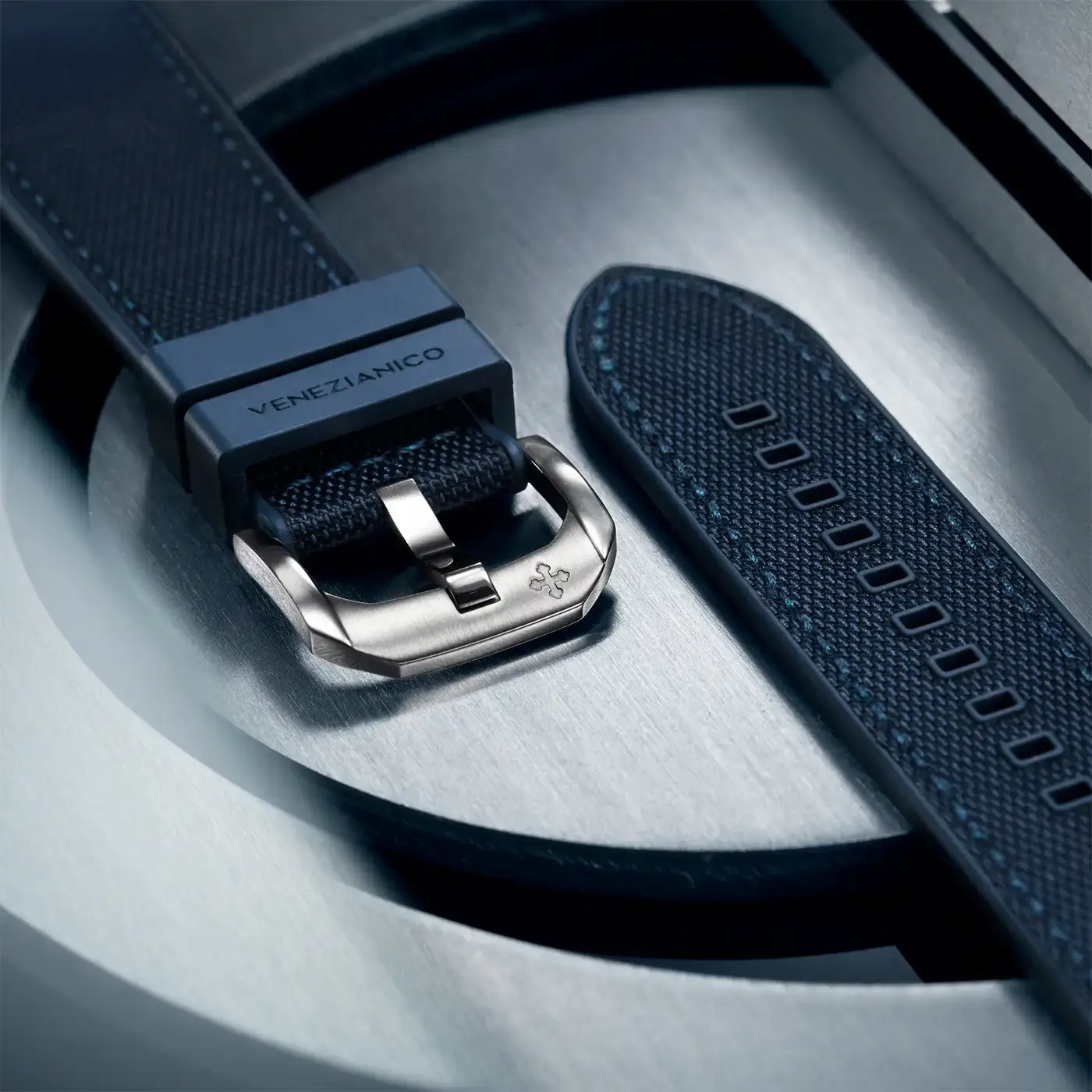 Nereide Titanio wprowadza innowacyjne rozwiązanie w postaci hybrydowego paska wykonanego z wodoodpornego włókna tekstylnego i gumy FKM – niezwykle wytrzymałego materiału, który czyni zegarek odpowiednim do każdej sytuacji, nawet tej ekstremalnej. Pasek ten nie tylko zapewnia maksymalną trwałość, ale również komfort użytkowania, dzięki swojej elastyczności i ergonomicznemu dopasowaniu. Zintegrowana tytanowa klamra harmonizuje z kopertą, gwarantując estetyczną spójność oraz funkcjonalność na najwyższym poziomie. Dla osób wymagających ekstremalnej wydajności w zestawie znajduje się dodatkowy elastyczny pasek o wadze zaledwie 14 gramów. Jego specjalny system zapinania zapewnia pewne utrzymanie zegarka na nadgarstku, nawet jeśli klamra się odczepi podczas aktywności sportowej. Dzięki tej konfiguracji zegarek męski w zestawie prezentowym Venezianico waży zaledwie 80 gramów, co w połączeniu z kopertą o średnicy 42 mm czyni go doskonałym wyborem zarówno dla miłośników nurkowania, jak i osób poszukujących lekkiego, zaawansowanego czasomierza.