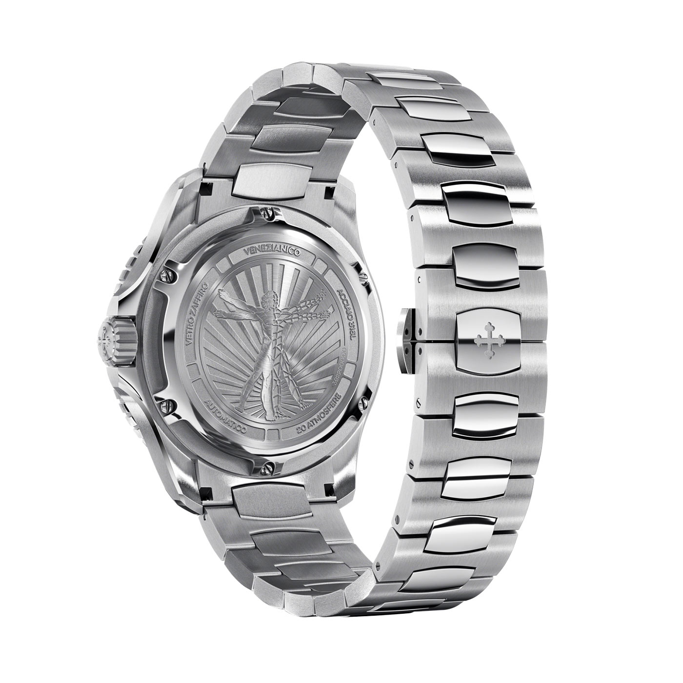 Koperta o średnicy 42 mm, wykonana ze stali nierdzewnej 316L, nadaje zegarkowi solidny, a jednocześnie elegancki wygląd na nadgarstku. Wewnątrz kryje automatyczny mechanizm Cal. Seiko NH70A, gwarantujący precyzyjne i niezawodne działanie. Połączenie błyszczących profili z satynowymi powierzchniami dodaje kopercie sportowo-eleganckiego charakteru. Dbałość o detale podkreślają również obrotowy bezel o karbowanej krawędzi oraz dekiel, wyróżniający się naprzemiennym ułożeniem śrub i rowków oraz trzema różnymi wykończeniami: radialnym satynowym, mikropiaskowaniem i polerowaniem. Całość uzupełnia bransoleta "Canova" z szesnastu form, której zapięcie motylkowe idealnie integruje się z centralnym ogniwem, tworząc spójną i wyrafinowaną całość.