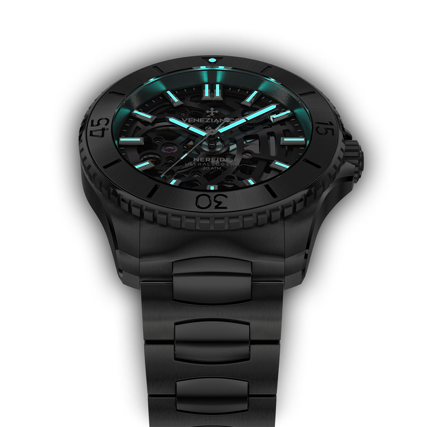 Jedną z najbardziej charakterystycznych cech konstrukcyjnych Nereide Ultraleggero jest innowacyjna, wielowarstwowa tarcza, chroniona patentem nr 102021000031718. Aby zredukować grubość i ciężar koperty, tarcza została podzielona na trzy nachodzące na siebie warstwy, z których pierwsza zastępuje pierścień dystansujący. Pomimo swojej skomplikowanej konstrukcji, zegarek zachowuje wszystkie kluczowe właściwości techniczne serii Nereide, takie jak wodoszczelność do 200 metrów, doskonała czytelność oraz wysoka odporność na naprężenia. Wskazówki i indeksy pokryte luminoforem BGW9 Super-LumiNova® zapewniają doskonałą widoczność w ciemności, emitując intensywną niebiesko-zieloną poświatę.