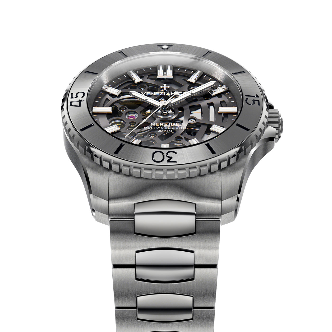 Venezianico Nereide Ultraleggero 42 3921509C to luksusowy zegarek szkieletowy, który na nowo definiuje granice nowoczesnego wzornictwa i technologii w zegarmistrzostwie, czerpiąc inspirację z renesansowego Człowieka Witruwiańskiego. Ten wyjątkowy model z serii Nereide wyróżnia się nie tylko unikalną estetyką, ale także zaawansowaną technologią. Innowacyjna, szkieletowana tarcza, doskonale komponująca się z mechanizmem, korzysta z opatentowanego systemu, który łączy w sobie funkcjonalność i lekkość, podkreślając związek między sztuką a nauką.