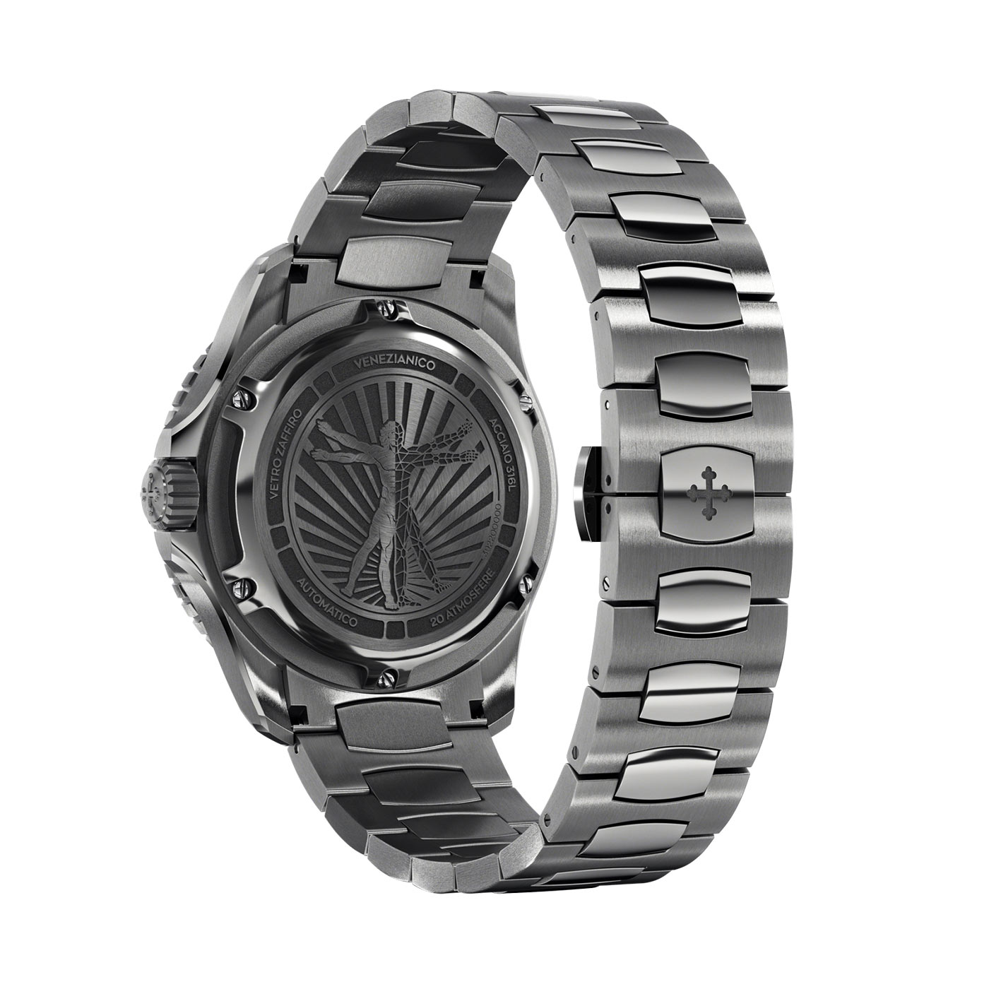 Koperta o średnicy 42 mm, wykonana ze stali nierdzewnej 316L o ciemnej powłoce, nadaje zegarkowi solidny, a jednocześnie elegancki wygląd na nadgarstku. Wewnątrz kryje automatyczny mechanizm Cal. NH70A, gwarantujący precyzyjne i niezawodne działanie. Połączenie błyszczących profili z satynowymi powierzchniami dodaje kopercie sportowo-eleganckiego charakteru. Dbałość o detale podkreślają również obrotowy bezel o karbowanej krawędzi oraz dekiel, wyróżniający się naprzemiennym ułożeniem śrub i rowków oraz trzema różnymi wykończeniami: radialnym satynowym, mikropiaskowaniem i polerowaniem. Całość uzupełnia bransoleta "Canova" z szesnastu form, której zapięcie motylkowe idealnie integruje się z centralnym ogniwem, tworząc spójną i wyrafinowaną całość.