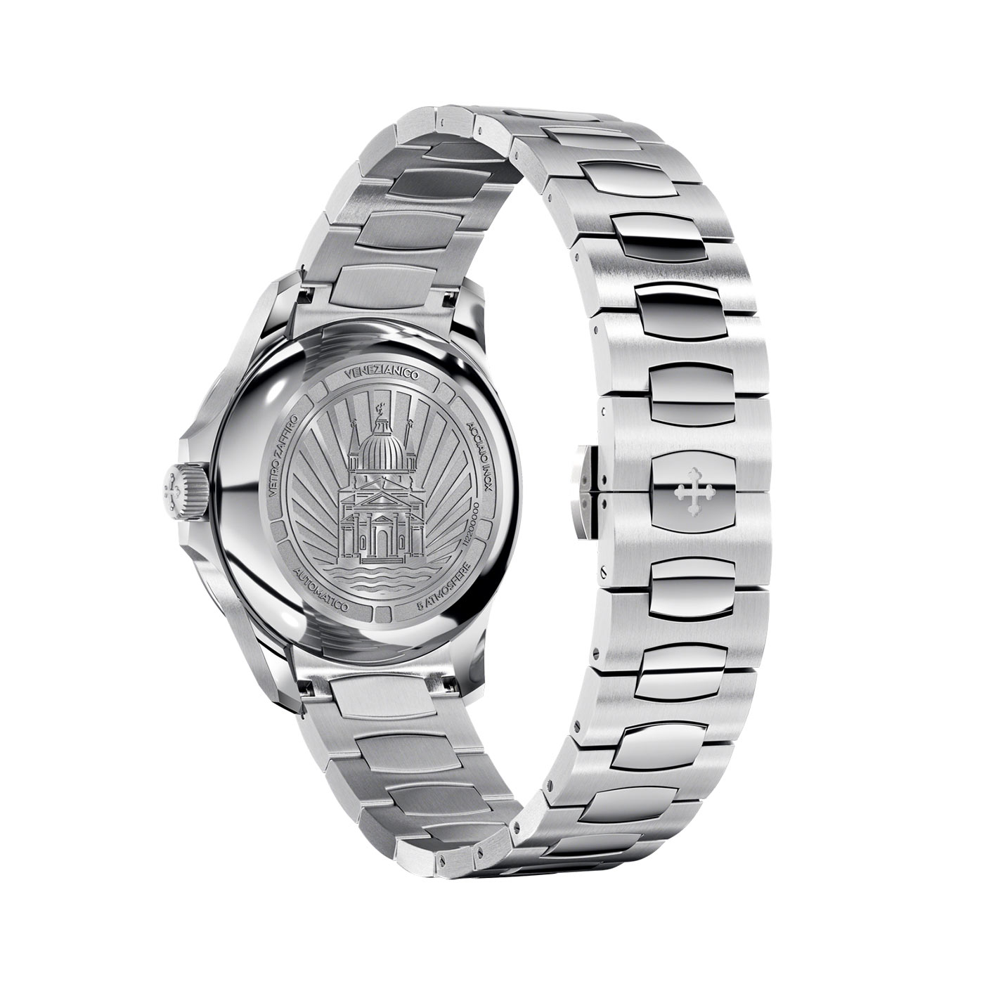 Sercem zegarka jest mechanizm Seiko NH35A, ceniony za niezawodność i precyzję. Dzięki systemowi naciągu kinetycznego automatyczny zegarek damski Venezianico Redentore Automatico dosłownie ożywa z każdym ruchem nadgarstka, stając się częścią rytmu dnia swojej właścicielki. Grawerowany dekiel z wizerunkiem bazyliki i matowym promienistym wykończeniem dopełnia tej wyjątkowej kompozycji, czyniąc zegarek symbolem ponadczasowego stylu oraz technicznego kunsztu. To model dla kobiety, która szuka harmonii między klasyką a współczesnością – z nutą włoskiego dolce vita.