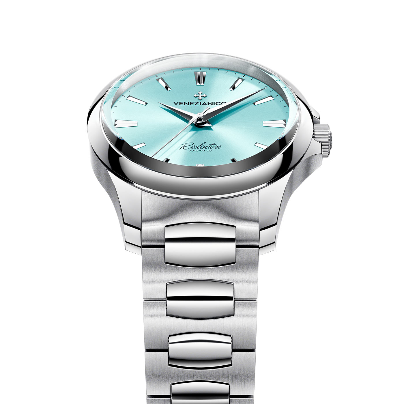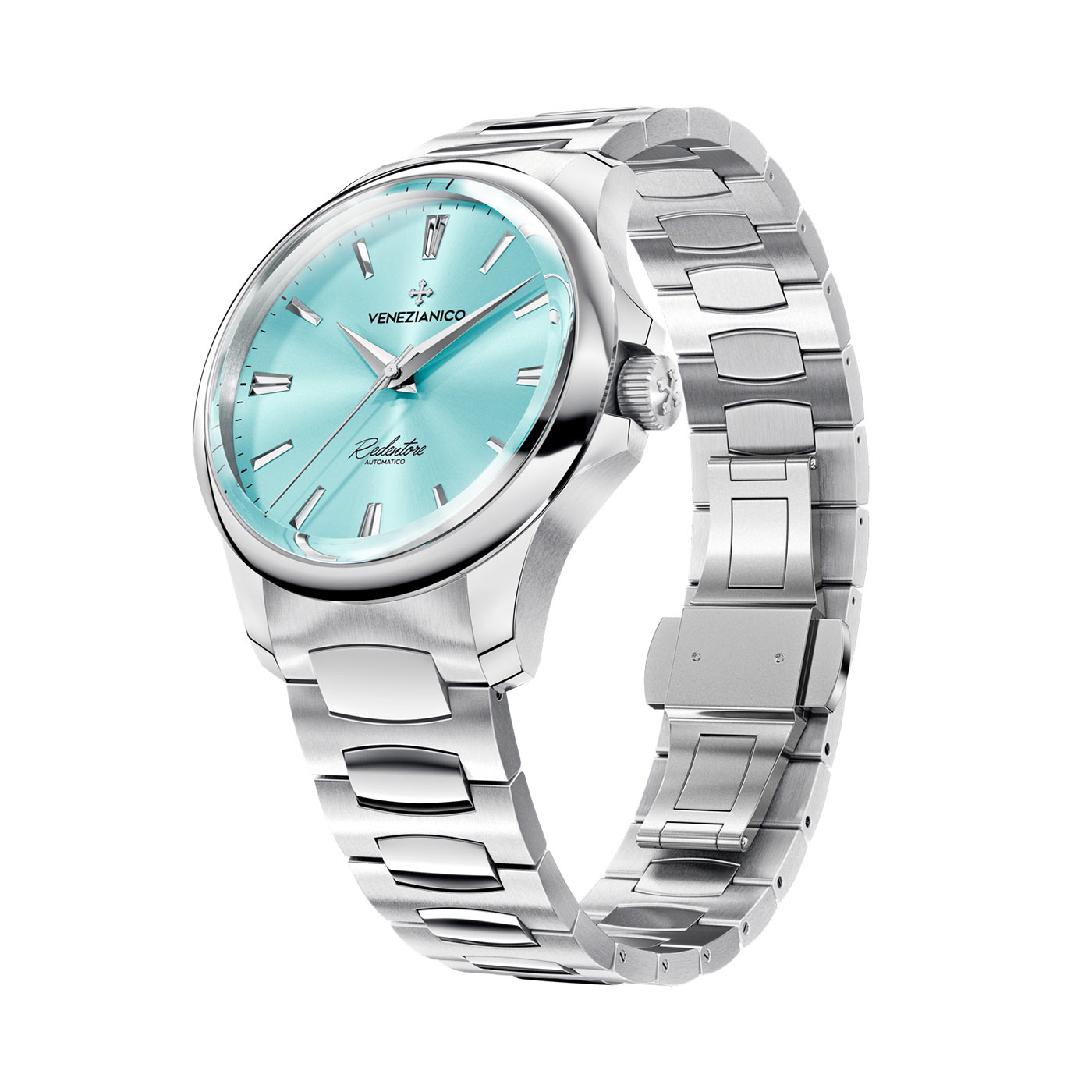 To, co natychmiast przyciąga spojrzenia, to turkusowa tarcza z wykończeniem sunray, która rozświetla się szlachetnym blaskiem w zależności od kąta padania światła. Zegarek damski z turkusową tarczą Venezianico zyskuje głębię dzięki smukłym indeksom i wskazówkom typu Dauphine – subtelnym ukłonem w stronę klasyki zegarmistrzostwa lat 30. Całość wieńczy bransoleta Canova Concept™ – autorski projekt marki – o zaawansowanej konstrukcji, wyróżniającej się podwójnym wykończeniem i perfekcyjnie zintegrowanym zapięciem motylkowym, które nie zaburza jej ciągłości.