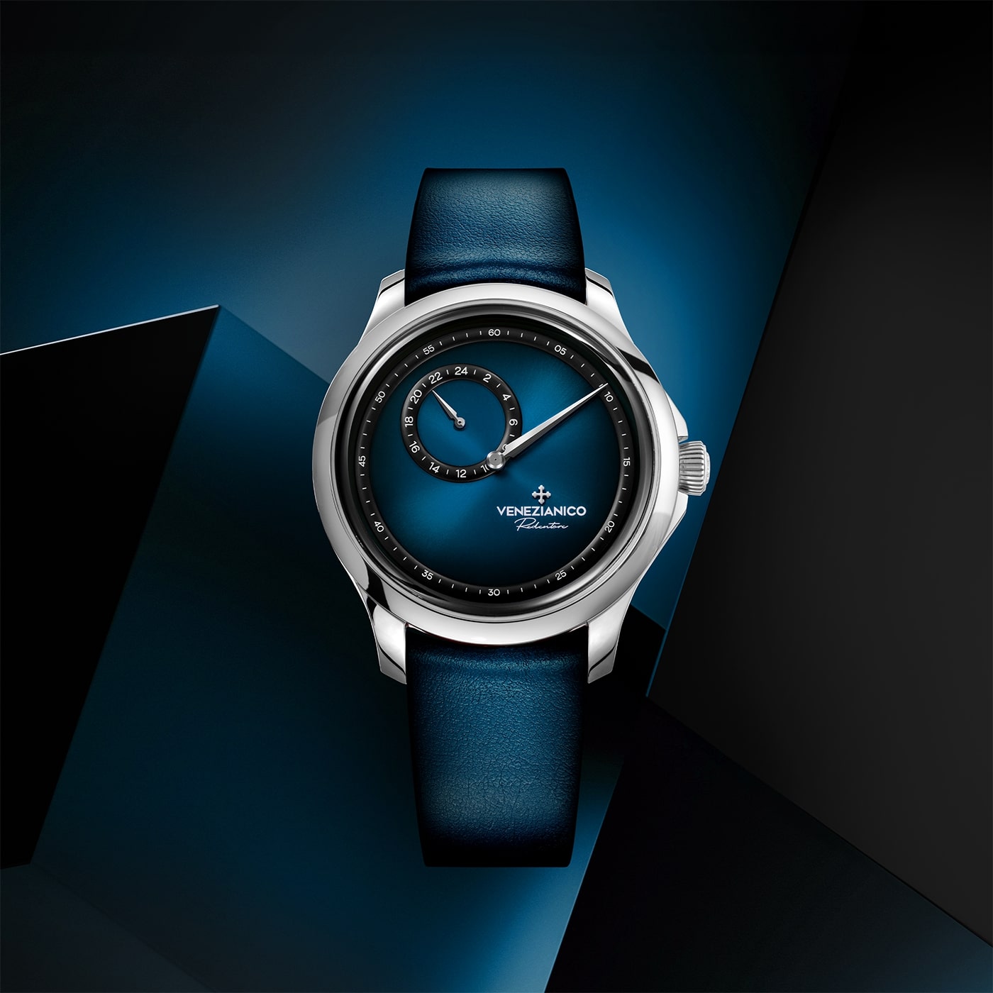 Venezianico Redentore Enigma 1221571 to wyjątkowy, enigmatyczny model, który łączy w sobie innowacyjne podejście do odczytywania czasu oraz klasyczny, minimalistyczny design. Jego wyróżniającą cechą jest mosiężna tarcza o konfiguracji Regulator, zaczerpnięta z XVIII wieku, gdzie godziny i minuty są prezentowane w osobnych sektorach, co oferuje wyraźniejszy odczyt oraz niezaprzeczalny wyróżnik estetyczny. Centralna wskazówka pokazuje minuty, a sub-tarcza oferuje dobowe wskazanie czasu. Brak indeksów na niebieskiej tarczy z eleganckim wykończeniem soleil i fumé tworzy harmonijną, czystą kompozycję, która przyciąga uwagę swym puryzmem i wyjątkowym charakterem. Eleganckie wskazówki typu dauphine, zamontowane na dwóch oddzielnych, kopułowych pierścieniach, nadają czasomierzowi wyrafinowanego, neoklasycznego stylu, szanującego tradycję.