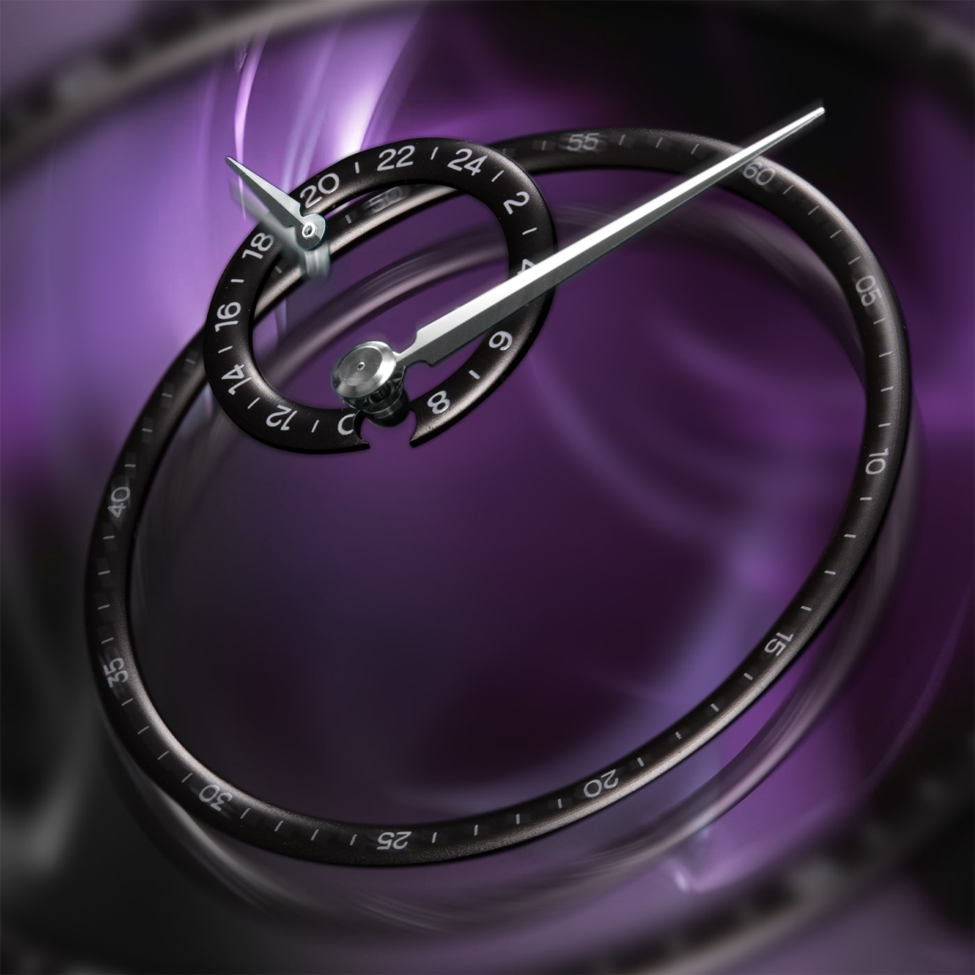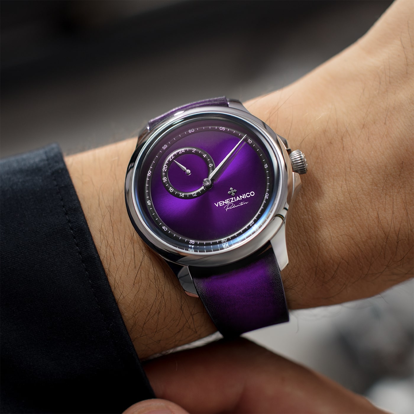 Venezianico Redentore Enigma 1221572 to wyjątkowy, enigmatyczny model, który łączy w sobie innowacyjne podejście do odczytywania czasu oraz klasyczny, minimalistyczny design. Jego wyróżniającą cechą jest mosiężna tarcza o konfiguracji Regulator, zaczerpnięta z XVIII wieku, gdzie godziny i minuty są prezentowane w osobnych sektorach, co oferuje wyraźniejszy odczyt oraz niezaprzeczalny wyróżnik estetyczny. Centralna wskazówka pokazuje minuty, a sub-tarcza oferuje dobowe wskazanie czasu. Brak indeksów na fioletowej tarczy z eleganckim wykończeniem soleil i fumé tworzy harmonijną, czystą kompozycję, która przyciąga uwagę swym puryzmem i wyjątkowym charakterem. Eleganckie wskazówki typu dauphine, zamontowane na dwóch oddzielnych, kopułowych pierścieniach, nadają czasomierzowi wyrafinowanego, neoklasycznego stylu, szanującego tradycję.