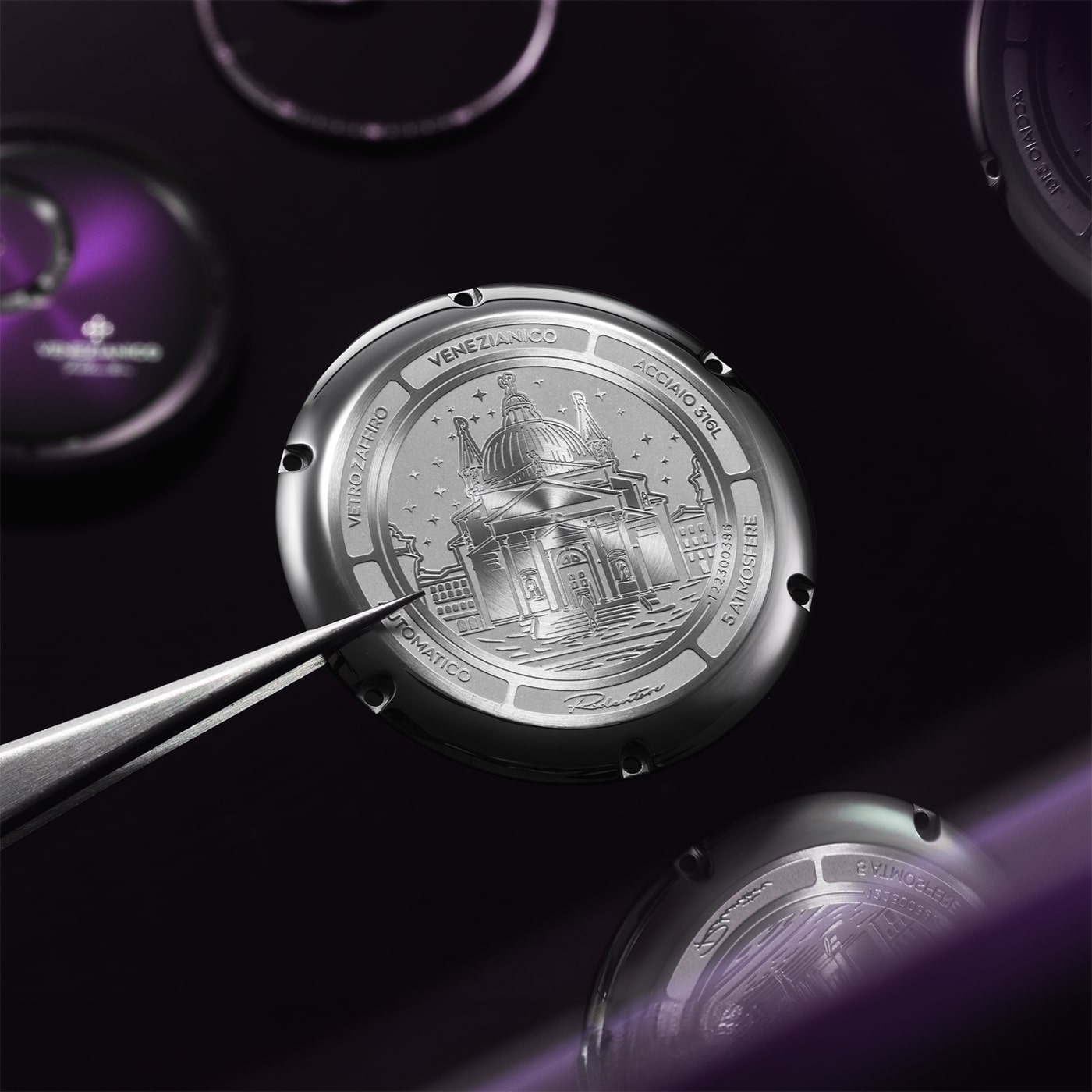 Materiały, z jakich wykonano zegarek z tarczą 24-godzinną Venezianico Redentore Enigma, są na najwyższym poziomie. Stal nierdzewna 316L, która tworzy solidną kopertę o średnicy 40 mm, gwarantuje nie tylko trwałość, ale i zmysłową elegancję, zwłaszcza w połączeniu z wykończeniem polerowanym. Koperta, o grubości 11,40 mm i szerokości lug-to-lug wynoszącej 46,70 mm, doskonale leży na nadgarstku, tworząc efekt idealnego dopasowania. Zegarek męski Venezianico 1221572 jest wyposażony w szafirowe szkło z powłoką antyrefleksyjną, co zapewnia przejrzystość i znakomitą odporność na zarysowania (9/10 w skali twardości Mohsa). Dzięki wodoszczelności na poziomie do około 50 metrów, model ten doskonale sprawdzi się w codziennych warunkach. Sercem Redentore Enigma Purple jest niezawodny, automatyczny mechanizm Seiko NH39A, który oferuje precyzję, jakiej oczekują miłośnicy zegarków mechanicznych.