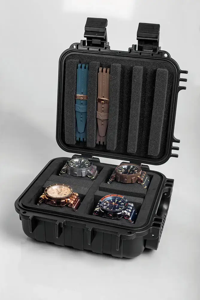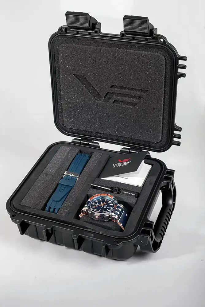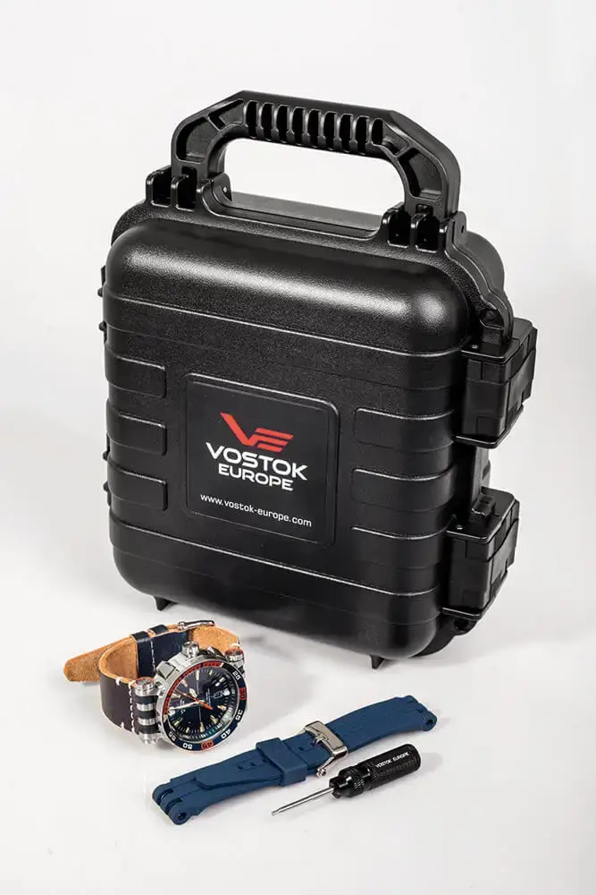 W zestawie znajduje się dodatkowy pasek silikonowy i pasek skórzany, które pozwalają dopasować masywny zegarek diver z kopertą z brązu Vostok Europe do warunków – od ekstremalnego nurkowania po eleganckie okazje. Oba mocowane są przy pomocy dedykowanego śrubokręta, co podkreśla profesjonalny charakter zestawu. Całość zapakowana została we wstrząsoodporne i wodoodporne etui VE Dry Box XL, które może pełnić funkcję praktycznej skrzyni kolekcjonerskiej mieszczącej cztery zegarki wraz z akcesoriami. VE Energia Rocket Bronze to zegarek, który łączy siłę, historię i przygodę – stworzony dla mężczyzn, którzy wymagają od swojego czasomierza więcej niż tylko odmierzania czasu.