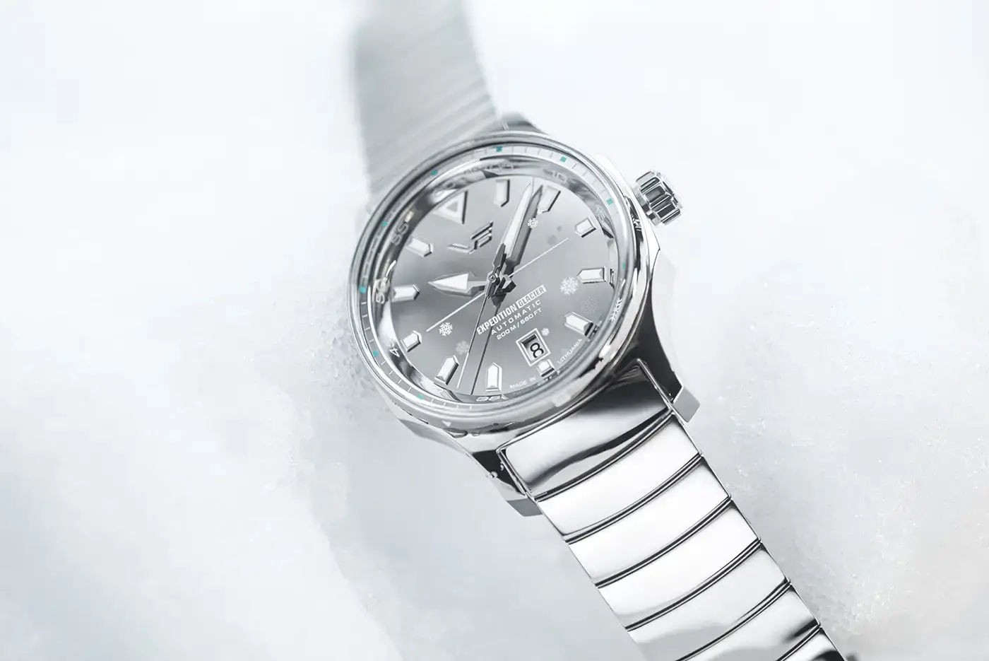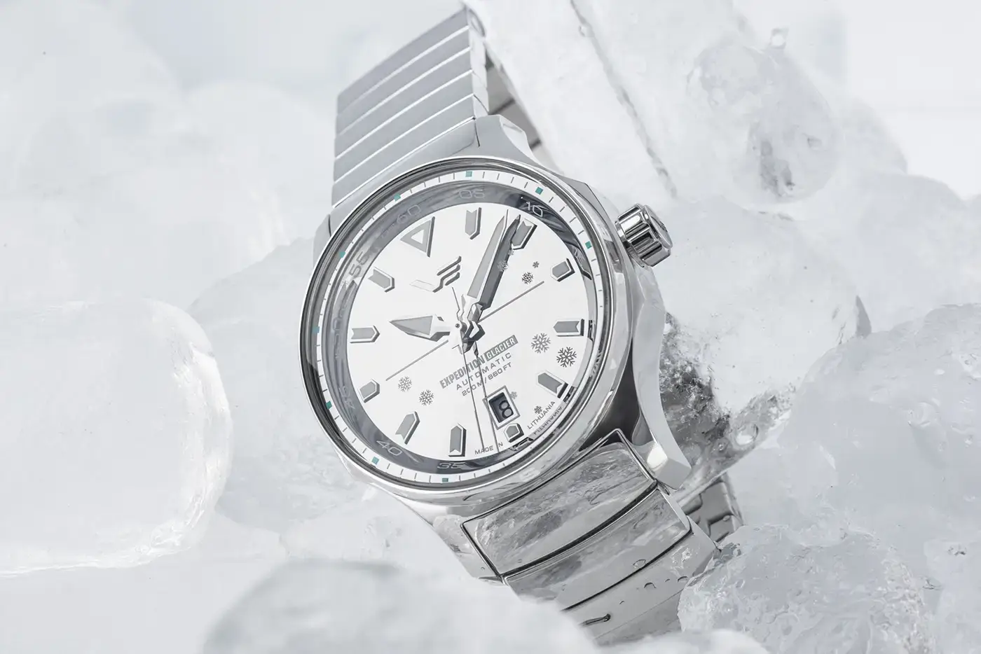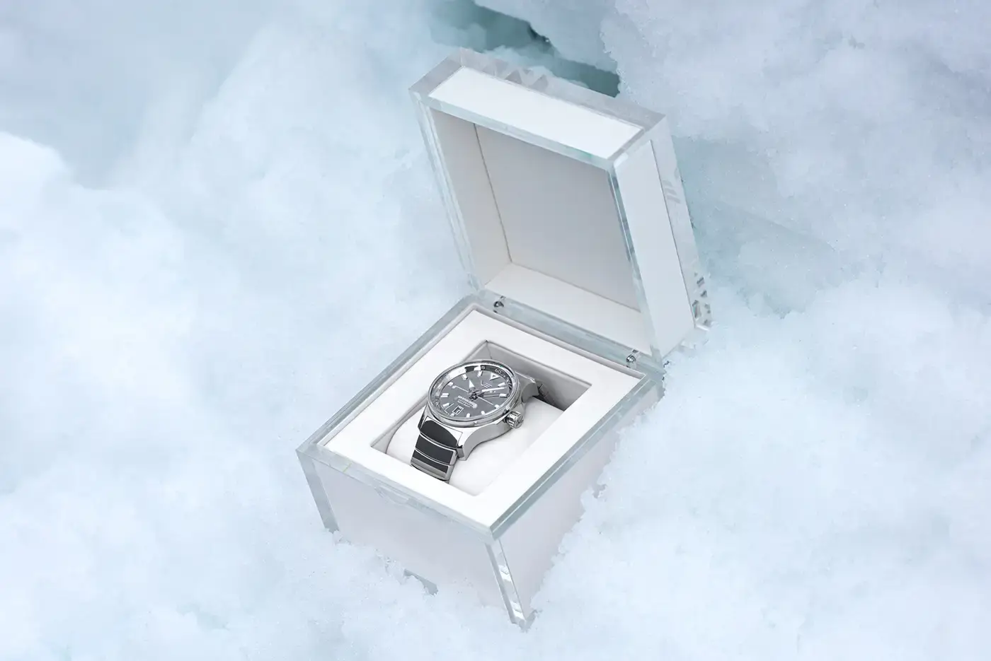 zegarek limitowany do 500 numerowanych egzemplarzy, dostarczany w unikatowe akrylowe pudełko przypominające bryłę lodu, tarcza, koperta i bransoleta polerowane na lustro