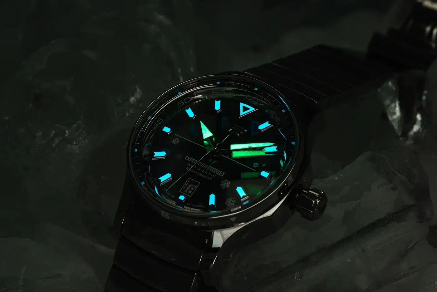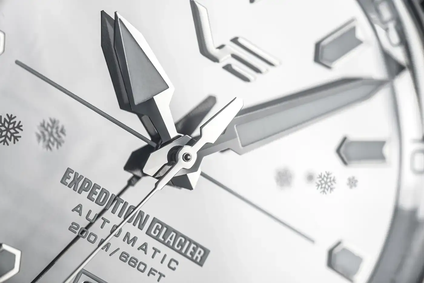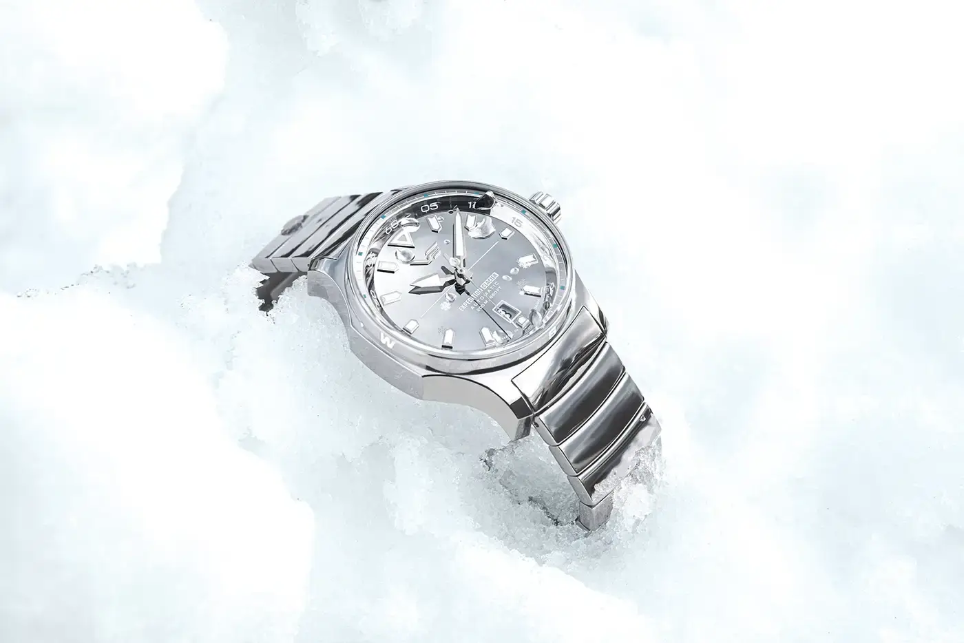 Każda widoczna powierzchnia została w pełni wypolerowana na lustro. Koperta, stalowa bransoleta, tarcza oraz wskazówki odbijają światło szklistym, mroźnym połyskiem, przywodzącym na myśl lodowiec skąpany w pierwszych promieniach słońca. Pod grubym, wypukłym szafirowym szkłem z powłoką antyrefleksyjną znajdują się masywne indeksy i wskazówki pokryte Super-LumiNova®, które zapewniają wyraźną, pewną czytelność po zmroku i w warunkach ograniczonego oświetlenia.