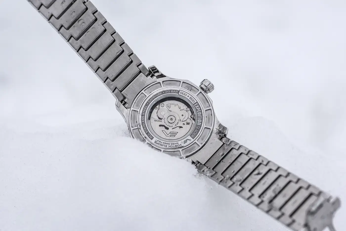 Sercem modelu Expedition Glacier Automatic jest sprawdzony japoński mechanizm automatyczny TMI NH35, ceniony za niezawodność i stabilną pracę zarówno w codziennym użytkowaniu, jak i podczas wymagających wypraw. 43-milimetrowa koperta ze stali nierdzewnej, zakręcana koronka i przeszklony dekiel z indywidualnym numerem limitacji 000*500 oraz wodoszczelność do około 200M/20 ATM czynią kolekcjonerski zegarek Vostok Europe NH35A-592A784B gotowym na pływanie, intensywne opady i kontakt z żywiołami. Całość dopełnia dedykowane akrylowe pudełko inspirowane bryłą lodu, które podkreśla unikalny charakter edycji limitowanej.