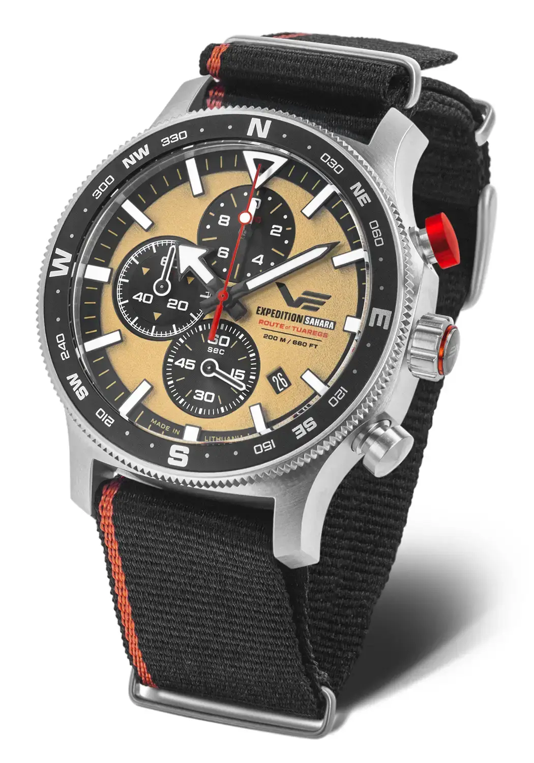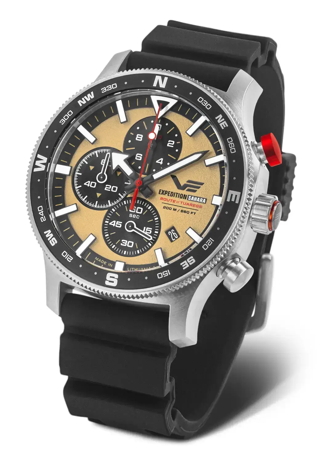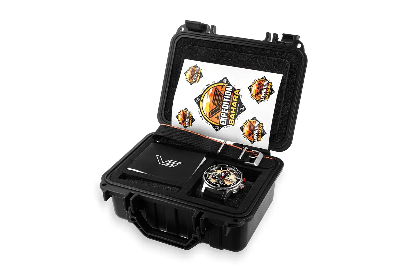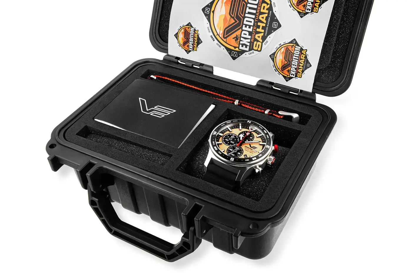 Zegarek chronograf Vostok Europe Expedition SAHARA Route of Tuaregs w limitowanej edycji to hołd dla odwagi, przygody i ekstremalnych wyzwań. Powstał we współpracy z ambasadorem marki i pasjonatem ekstremalnej motoryzacji Karolisem Mieliauskasem, który przetestował go podczas 2500-kilometrowej wyprawy przez Saharę