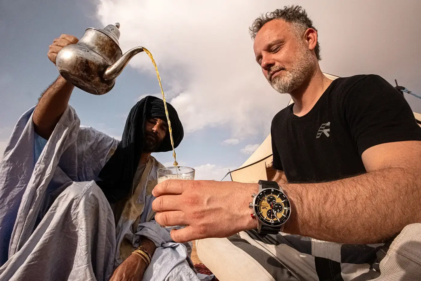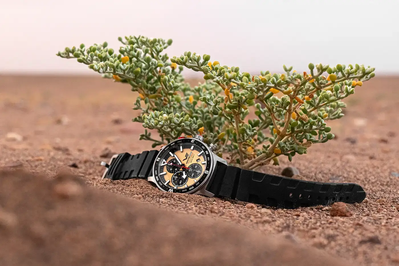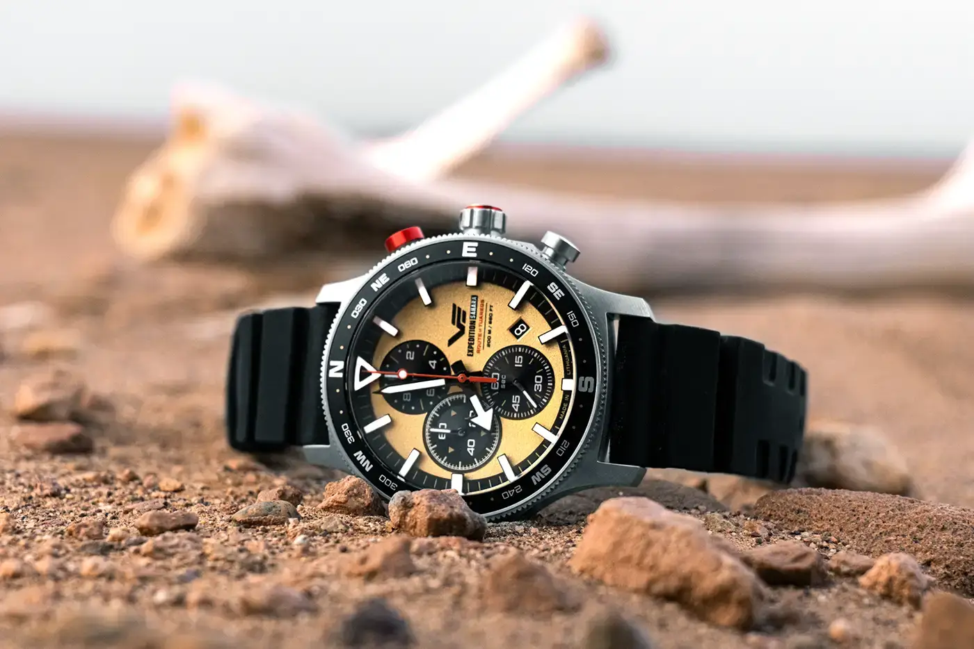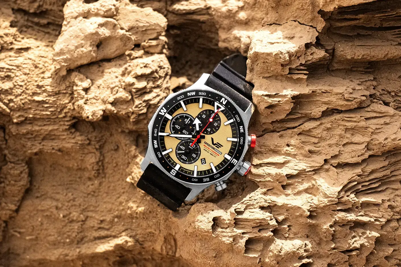 Zegarek chronograf Vostok Europe Expedition SAHARA Route of Tuaregs w limitowanej edycji to hołd dla odwagi, przygody i ekstremalnych wyzwań. Powstał we współpracy z ambasadorem marki i pasjonatem ekstremalnej motoryzacji Karolisem Mieliauskasem, który przetestował go podczas 2500-kilometrowej wyprawy przez Saharę