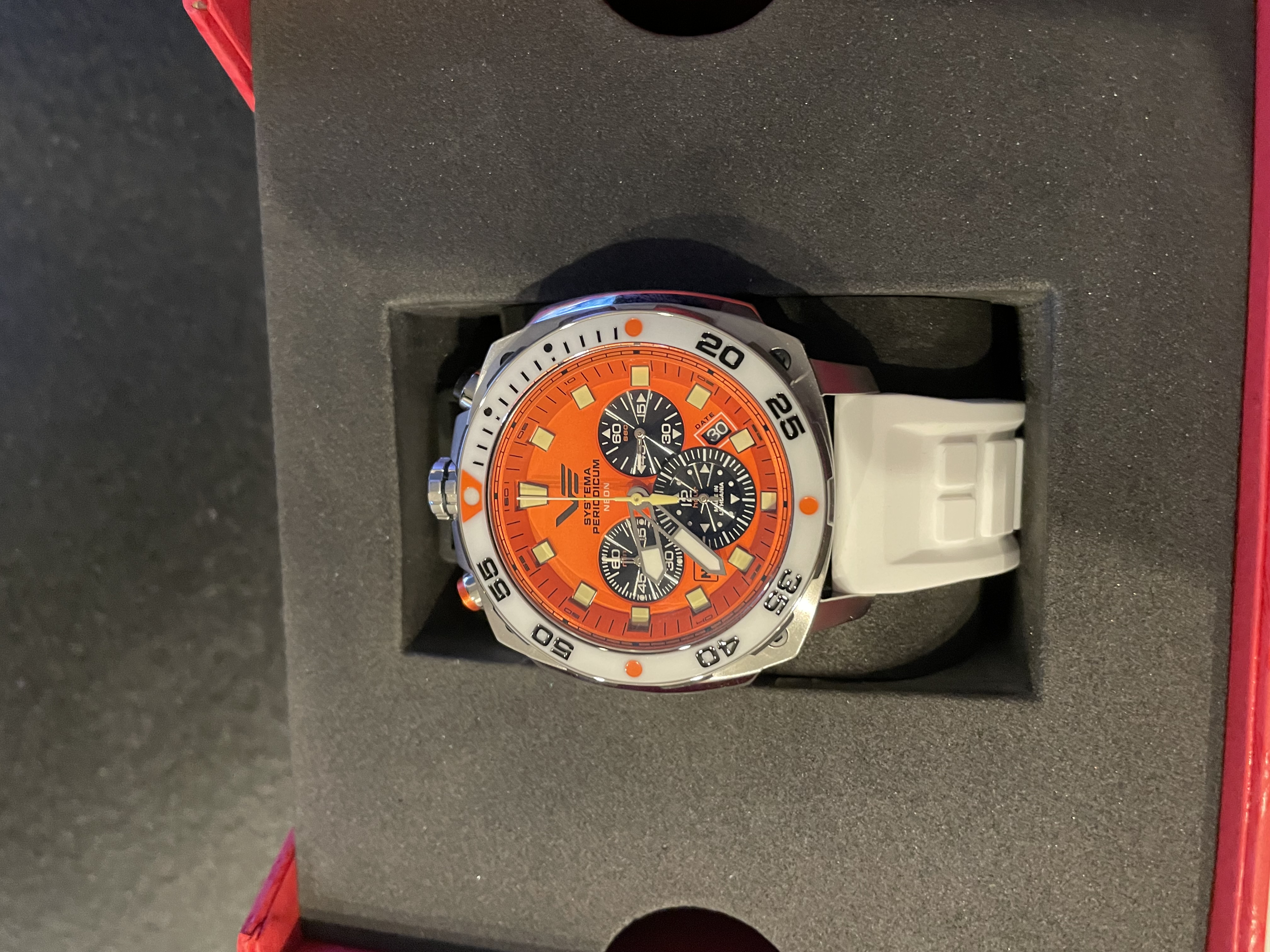 Vostok Europe Systema Periodicum Neon VK67-650A723 to wyjątkowy zegarek z chronografem, inspirowany układem okresowym pierwiastków chemicznych znanych jako „Systema Periodicum”. Stworzony w 1869 roku, układ ten jest fundamentem nowoczesnej chemii, obejmującym 118 pierwiastków i przewidującym właściwości nowych, nieodkrytych elementów. Każdy model z tej kolekcji dedykuje się konkretnemu pierwiastkowi, z jego opisem i symbolem na odwrocie koperty — jak neon (Ne), gaz obojętny, charakteryzujący się bardzo niską reaktywnością chemiczną, emitujący w polu elektrycznym jasne światło o pomarańczowo-czerwonym zabarwieniu.
