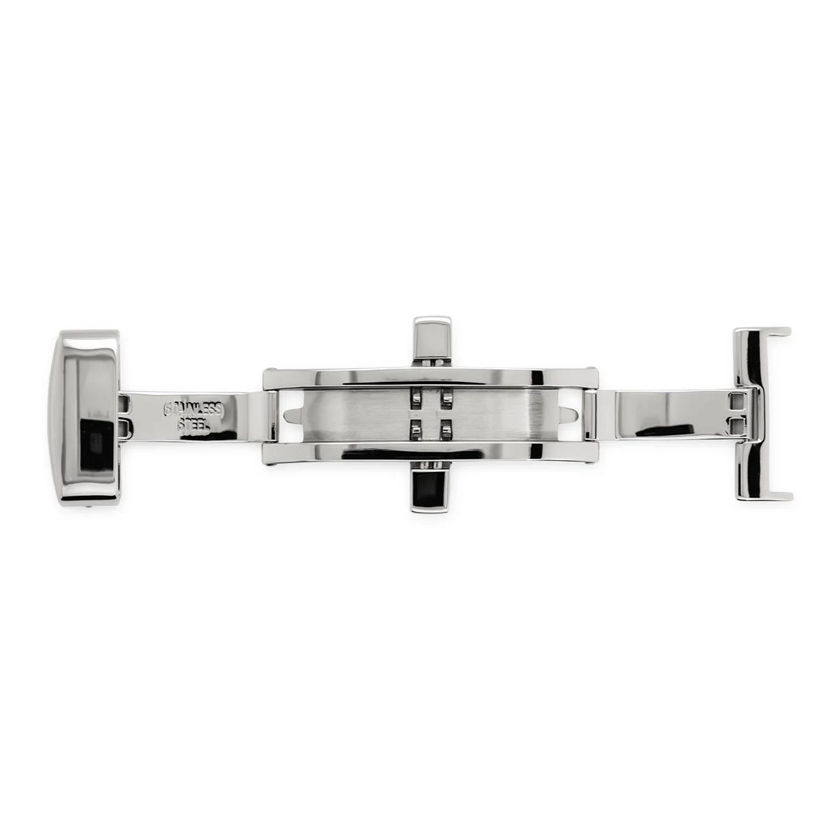 Mechanizm push button z dwoma przyciskami otwiera się płynnie i bezpiecznie, a konstrukcja double deployant równomiernie rozkłada naprężenia, ograniczając zużycie dziurek oraz krawędzi paska względem klasycznej klamry. Montaż jest prosty: w miejscu dotychczasowej klamerki od spodu znajduje się uchylna klapka z bolcem, który wchodzi w otwór paska; w komplecie otrzymują Państwo teleskop do osadzenia w pasku. Gładko wypolerowana stal (wysoki połysk) sprawia, że zapięcie prezentuje się elegancko zarówno przy zegarkach codziennych, jak i garniturowych.