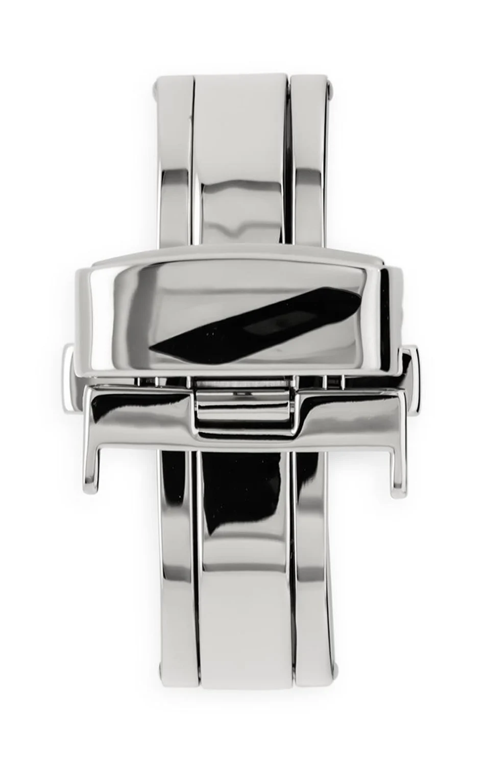 Srebrne, polerowane zapięcie typu butterfly z przyciskami. Zmniejsza zużycie paska i podnosi komfort. Dostępne rozmiary 14, 16, 18, 20, 22 mm.