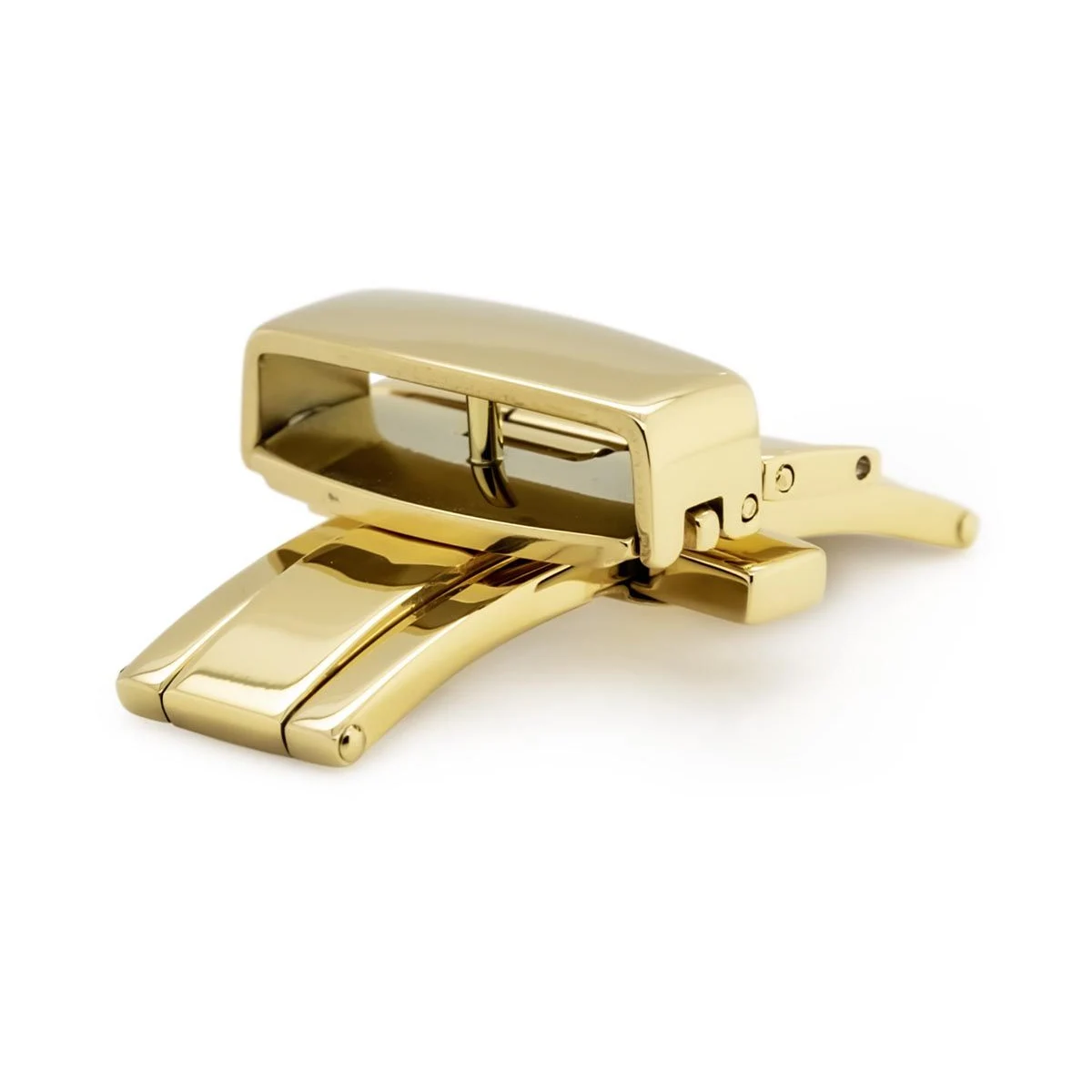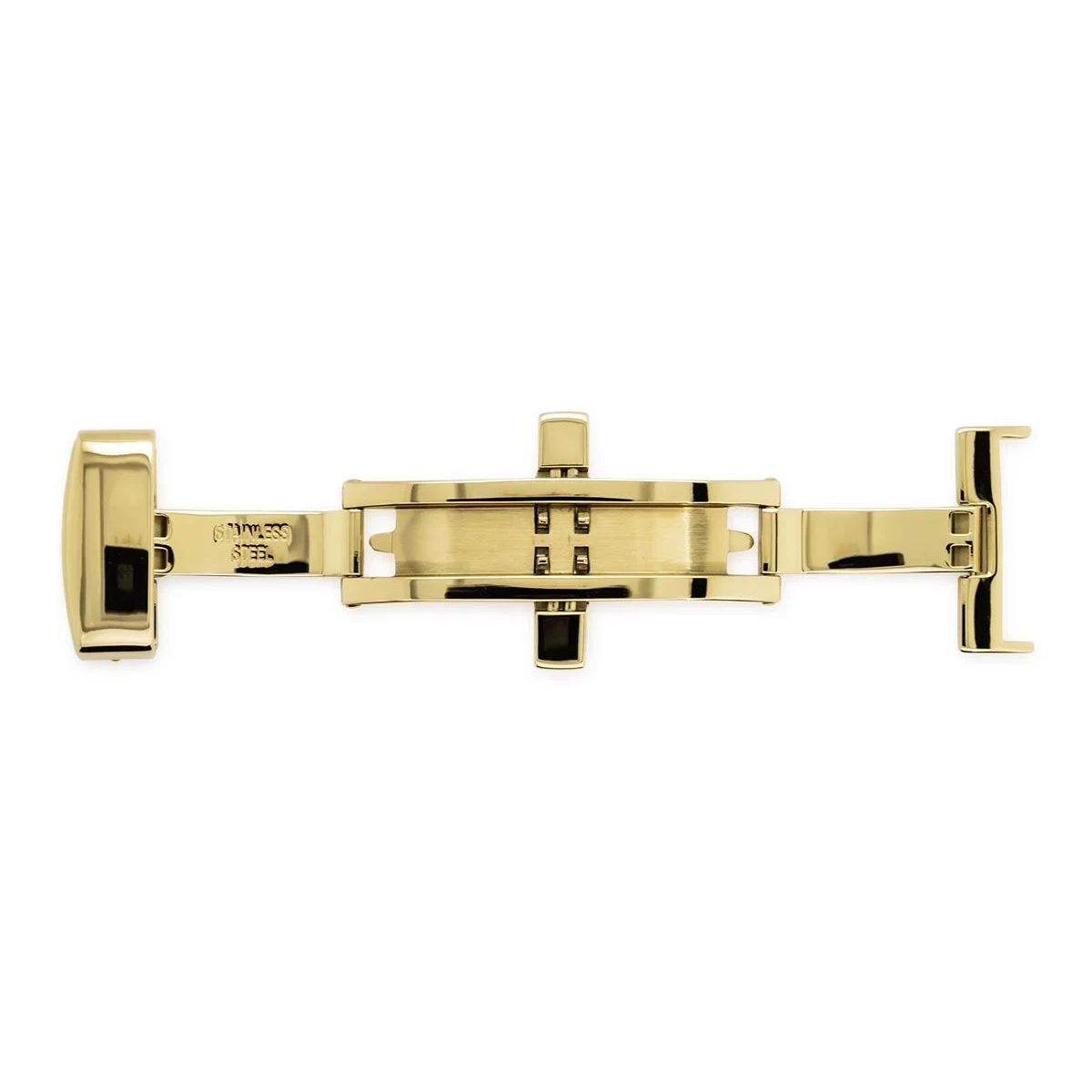 Stalowe zapięcie motylkowe w odcieniu żółtego złota. Mechanizm na dwa przyciski, mniejsze zużycie paska niż przy klasycznej klamrze. Rozmiary 14–22 mm.