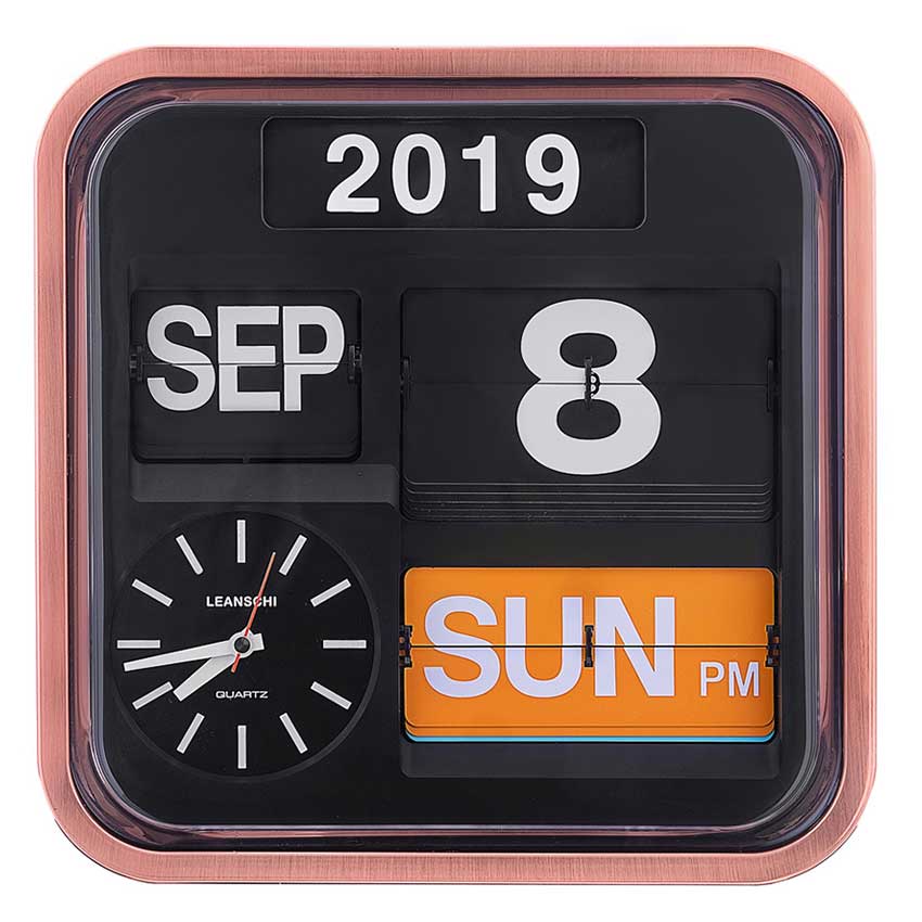 Duży zegar ścienny Leanschi CLOK-AC02 w stylu vintage ścienny z pełnym datownikiem. Zegar o wymiarach 32 x 32 x 11 cm wygląda niesamowicie dzięki szczotkowanemu wykończeniu przypominającemu miedzi i doskonale pasuje do współczesnego wnętrza. Cyfrowo sterowany vintage flip-display pokazuje pełną datę, w tym rok, dzień tygodnia i dzień miesiąca. Dzięki swoim rozmiarom wyświetlacz jest bardzo czytelny z daleka. Czas wskazywany jest przez precyzyjny mechanizm kwarcowy. Oznacza to, że po włączeniu wyświetla prawidłową datę każdego dnia i za każdym razem. Wymagana jest jednorazowa korekta raz w roku pod koniec lutego.