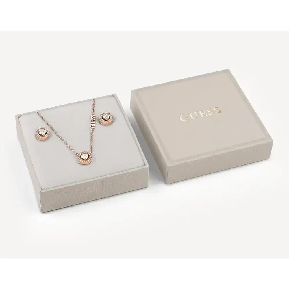 Zestaw biżuterii Guess M'Ama Non M'Ama JUBS04694JWRGT/U to elegancka propozycja, zawierająca kolczyki i bransoletkę ze stali nierdzewnej, platerowanej różowym złotem. Bransoletka ma łańcuszek z charmsem w kształcie serca, ozdobionym kryształkiem solitaire, a kolczyki przybierają formę serca z tym samym kryształem. Całość zdobiona jest błyszczącymi kryształkami i sześciennymi cyrkoniami. Bransoletka zapinana jest na haczyk, a kolczyki mają zapięcie na sztyft.